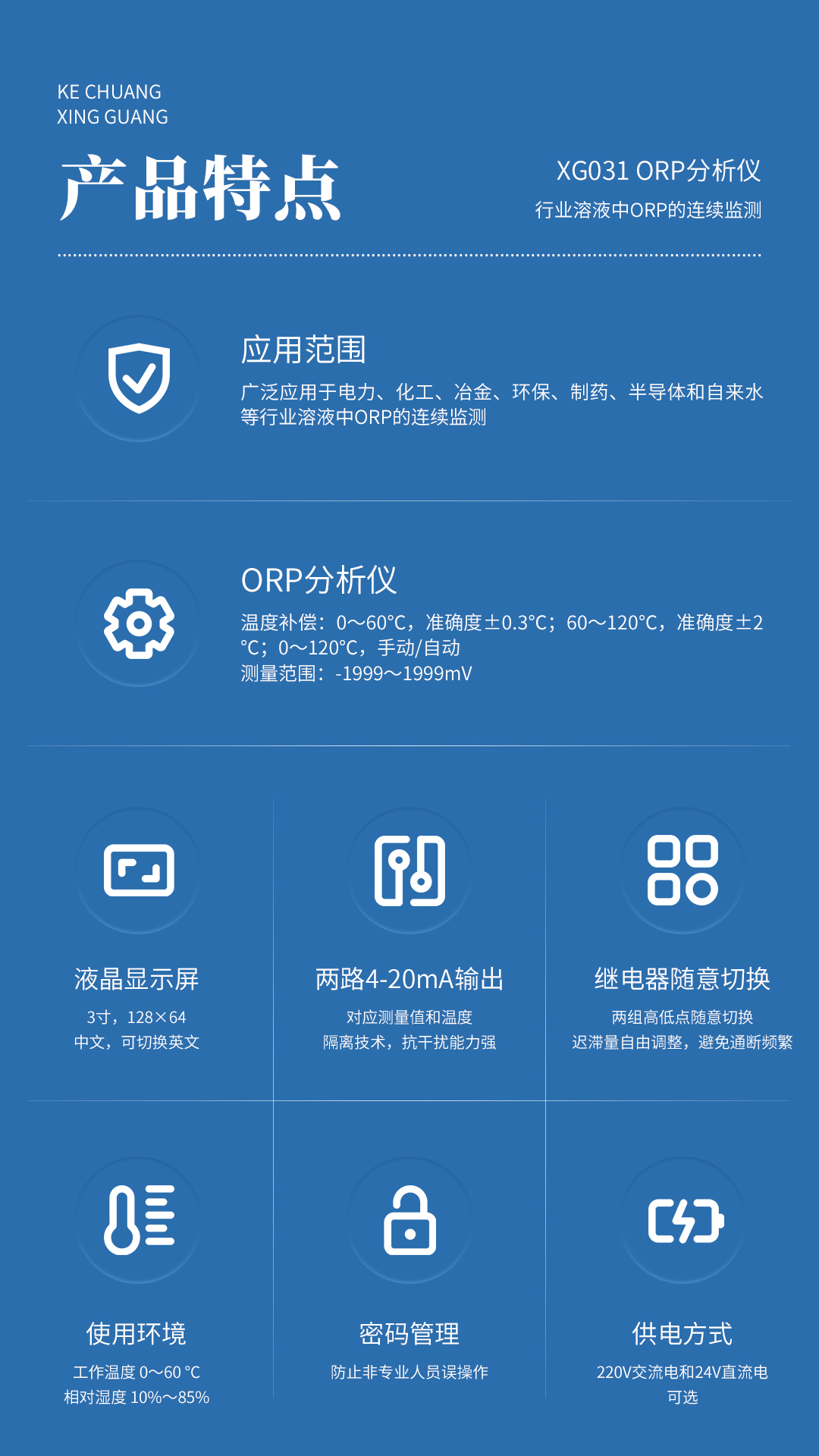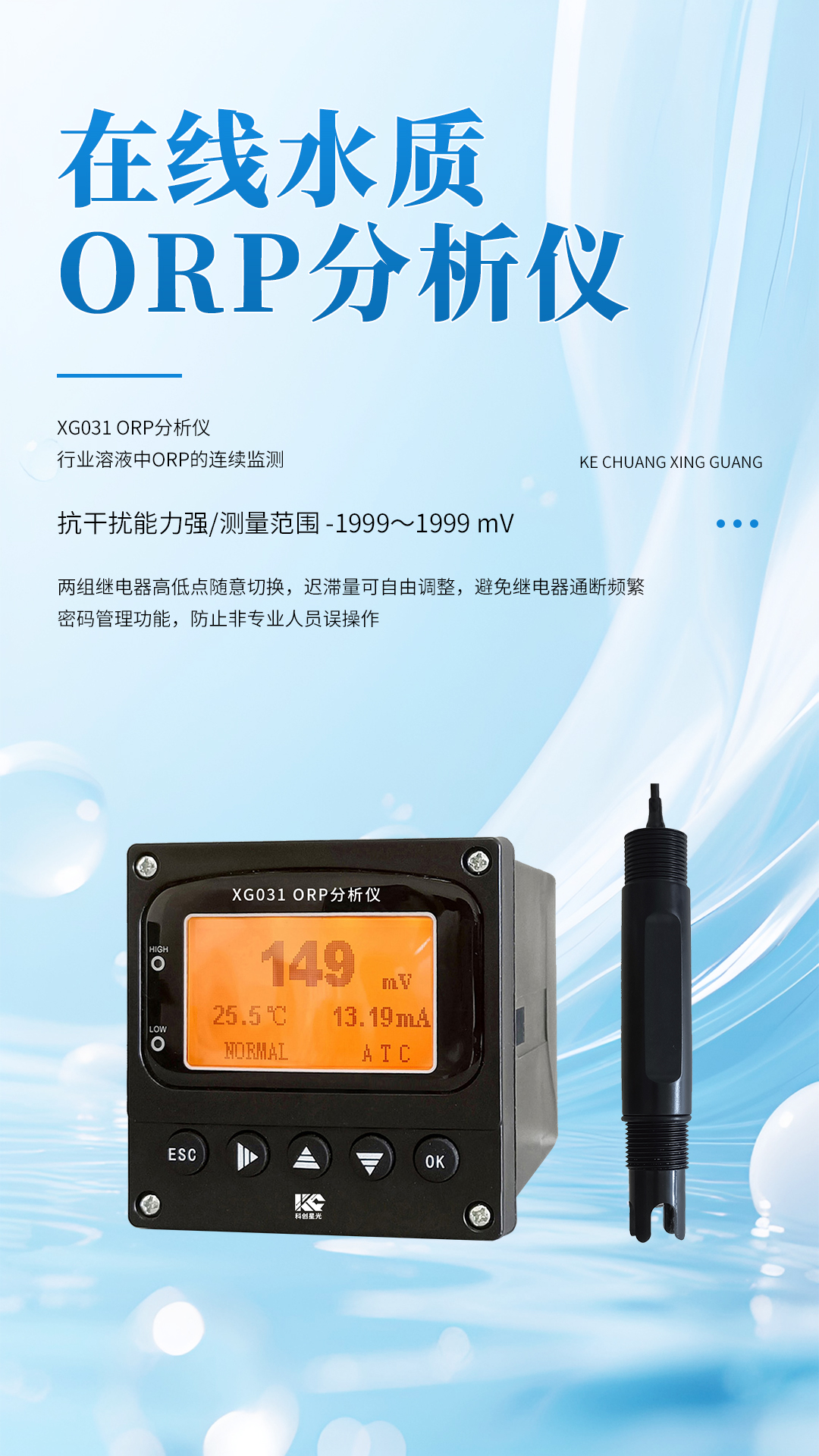 XG031 ORP分析仪 广泛应用于电力、化工、冶金、环保、制药、半导体和自来水等行业溶液中ORP的连续监测。