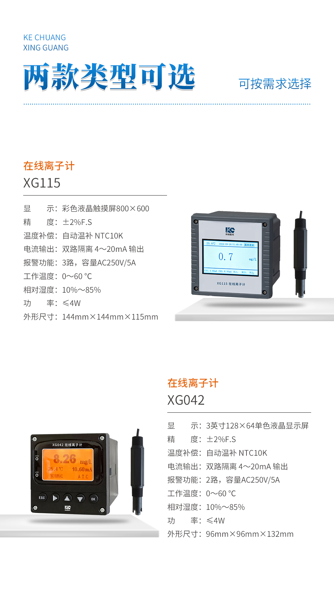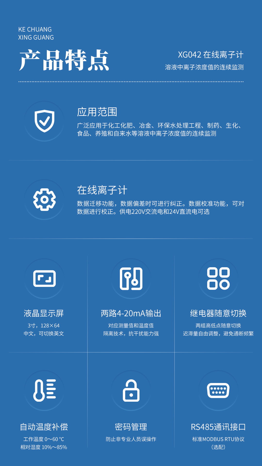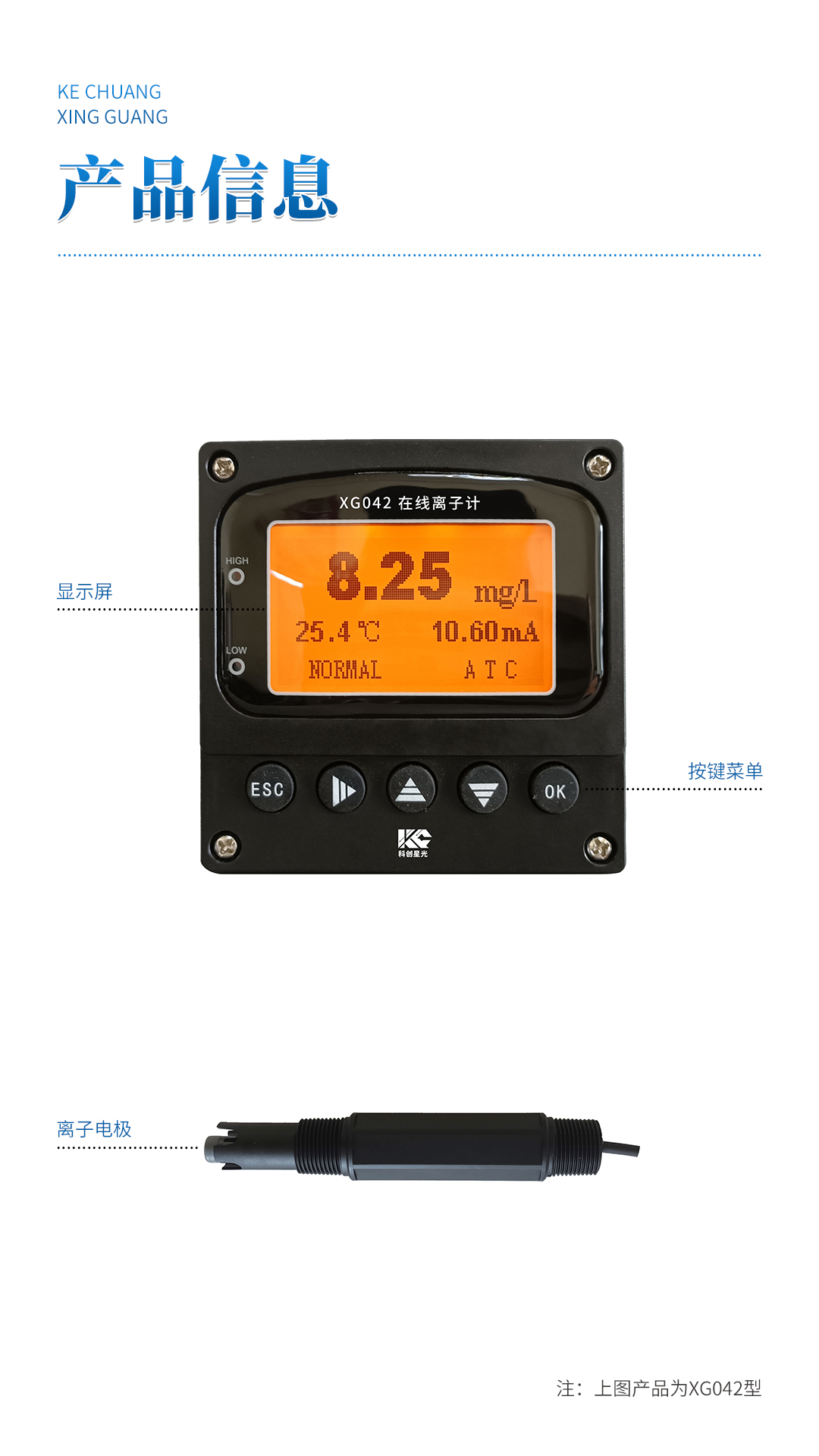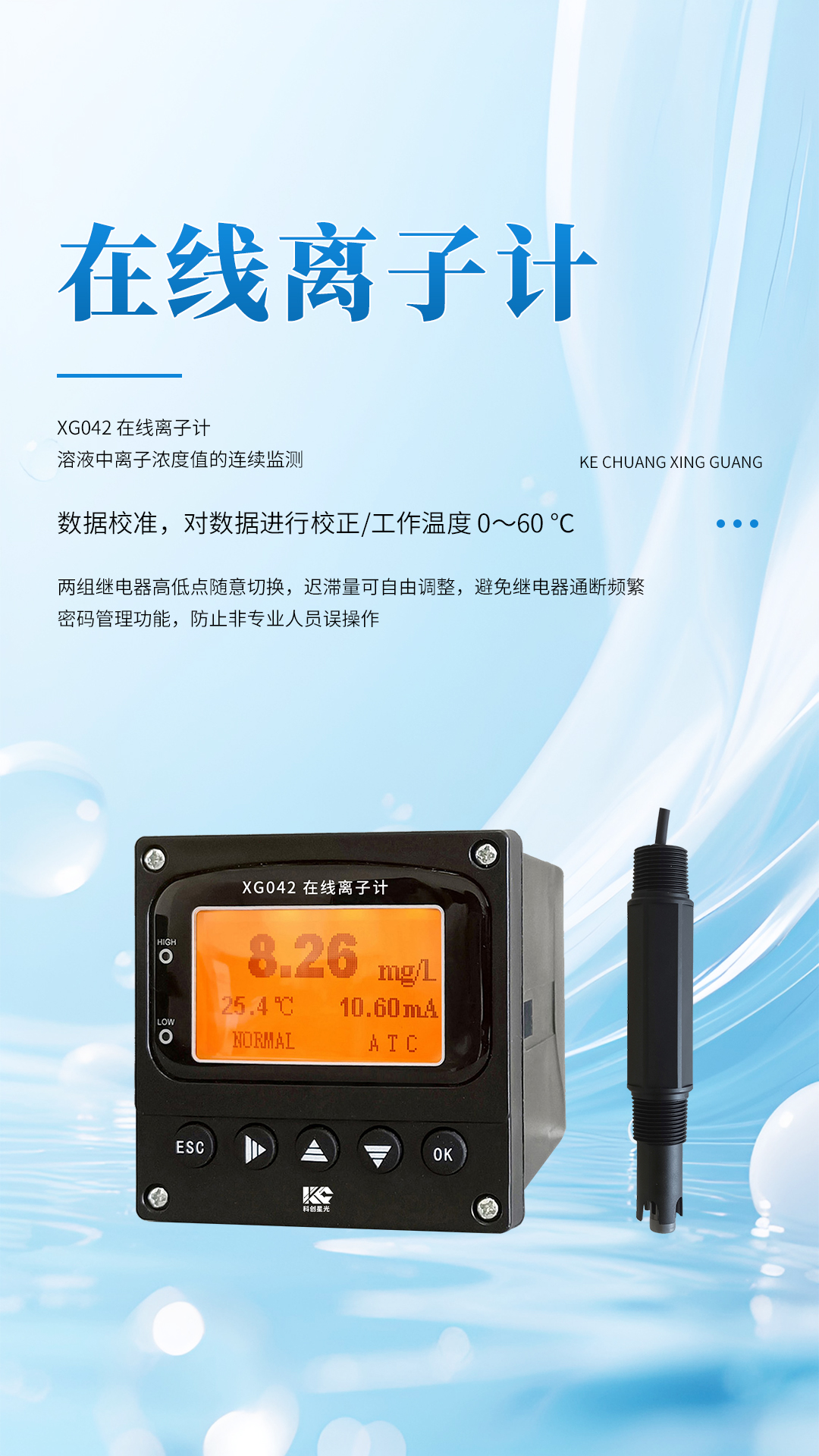 XG042 在线离子计 是我公司最新研发生产的一款在线智能变送器/控制器,采用进口元器件和离子渗透膜头,基于最新的极谱分析技术,及先进的生产工艺和表贴技术。运用这一系列先进的分析技术,确保仪器长期工作稳定可靠和准确性。可广泛应用于化工化肥、冶金、环保水处理工程、制药、生化、食品、养殖和自来水等溶液中离子浓度值的连续监测。