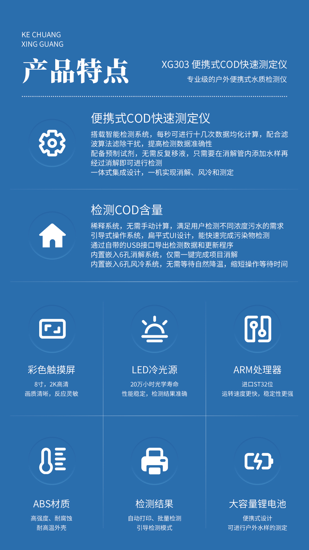 XG303 便携式COD快速测定仪 是一款专业级的户外便携式水质检测仪,一体式集成设计,一机实现消解、风冷、检测等功能。内置大容量锂电池可实现无外接供电工作,仪器采用LED冷光源和光学结构,搭载智能检测系统,每秒可进行十几次数据均化计算,进口ST32位ARM处理器,运转速度更快,稳定性更强。从而飞跃性的实现了水质测定仪的智能化、高性能、低噪音、稳定性强的特点。8英寸2K高清彩色触摸屏,让检测结果直观明了,可检测COD含量,产品内置水质分析、光度测量、系数曲线、样品曲线等多种应用程序。仪器广泛应用于科研院所、污水处理、环境监测、石油化工、造纸、制药、印染、纺织、皮革、酿酒、电子、市政、高校等行业并受到广大用户一致好评。