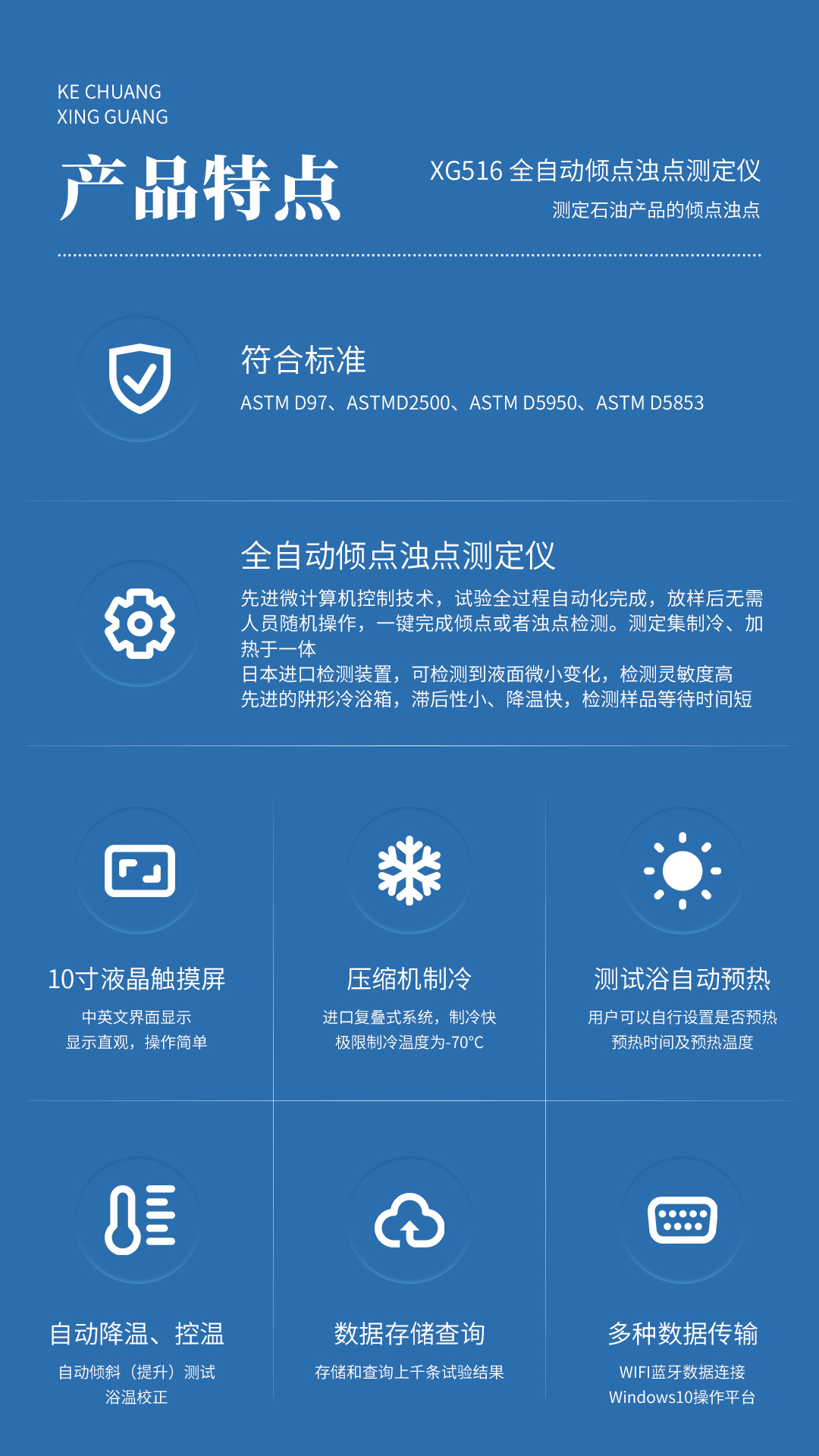XG516 全自动倾点浊点测定仪 执行标准:ASTM D97、ASTMD2500、ASTM D5950、ASTM D5853,用于测定石油产品的倾点浊点。全自动倾点浊点测定仪采用单个测试浴的测定方式,操作者可以通过键盘、触摸屏或鼠标操作控制仪器,整个过程全自动,而且整个测试过程可以观察到油样的流动情况。