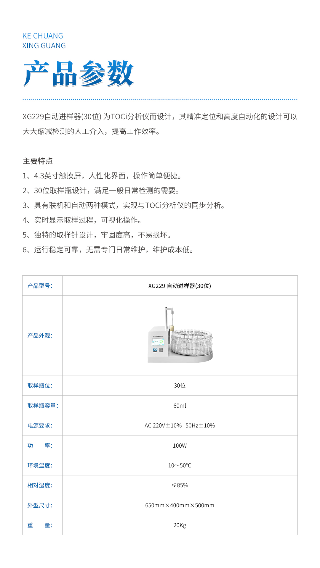XG229 自动进样器(30位) 为TOCi分析仪而设计,其精准定位和高度自动化的设计可以大大缩减检测的人工介入,提高工作效率。