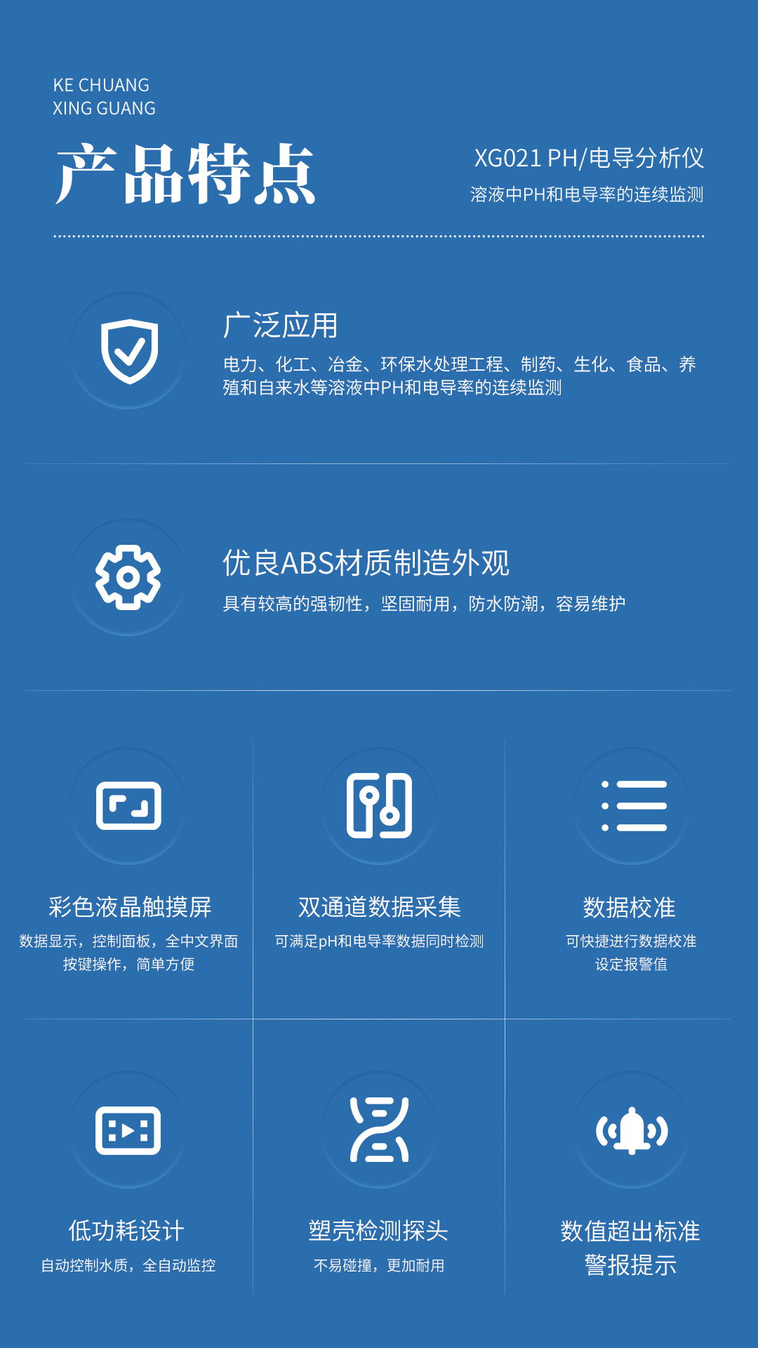 XG021 PH/电导分析仪 广泛应用于电力、化工、冶金、环保水处理工程、制药、生化、食品、养殖和自来水等溶液中PH和电导率的连续监测。