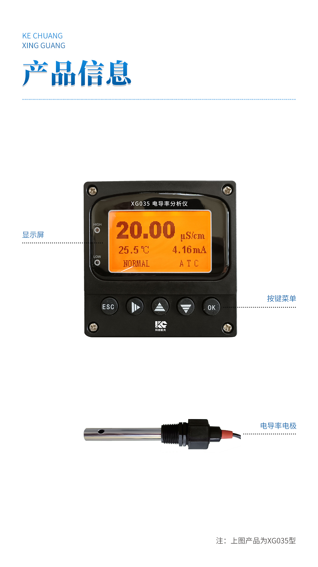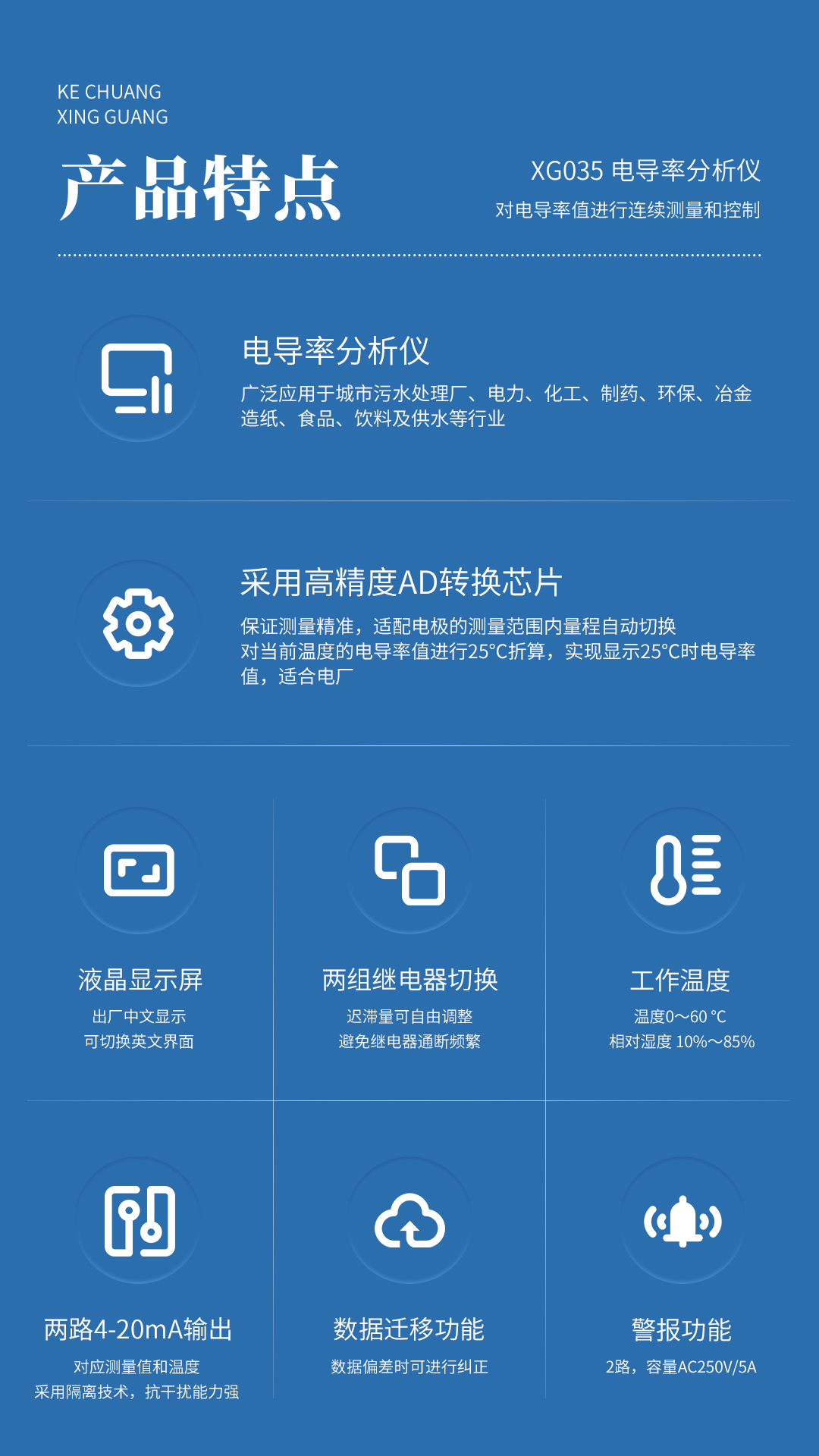 XG035 电导率分析仪 可对各种工业用水的电导率值进行连续测量和控制,本装置广泛应用于城市污水处理厂、电力、化工、制药、环保、冶金、造纸、食品、饮料及供水等行业。