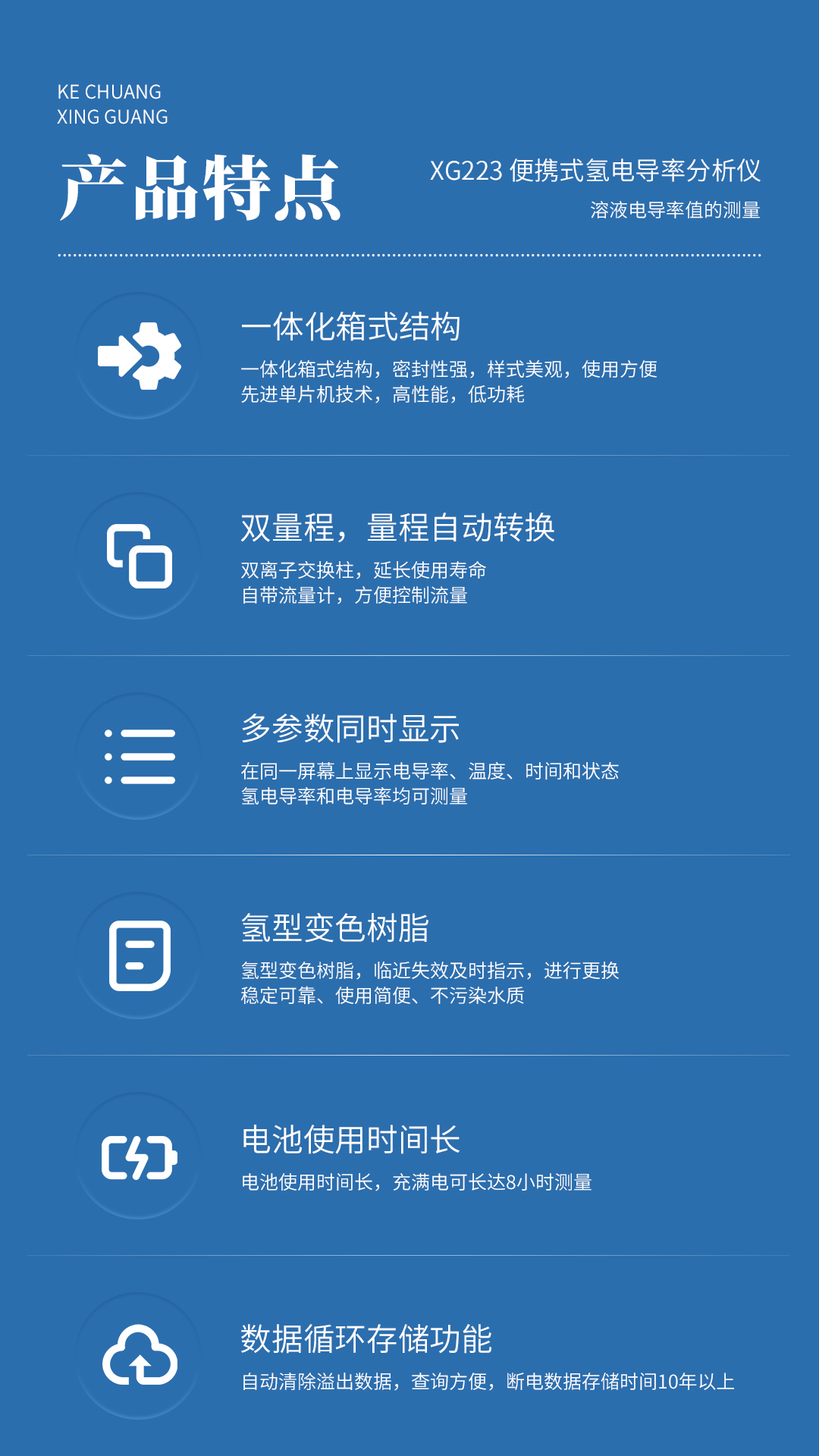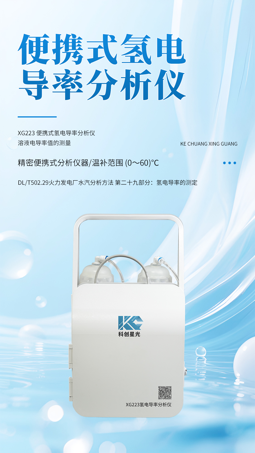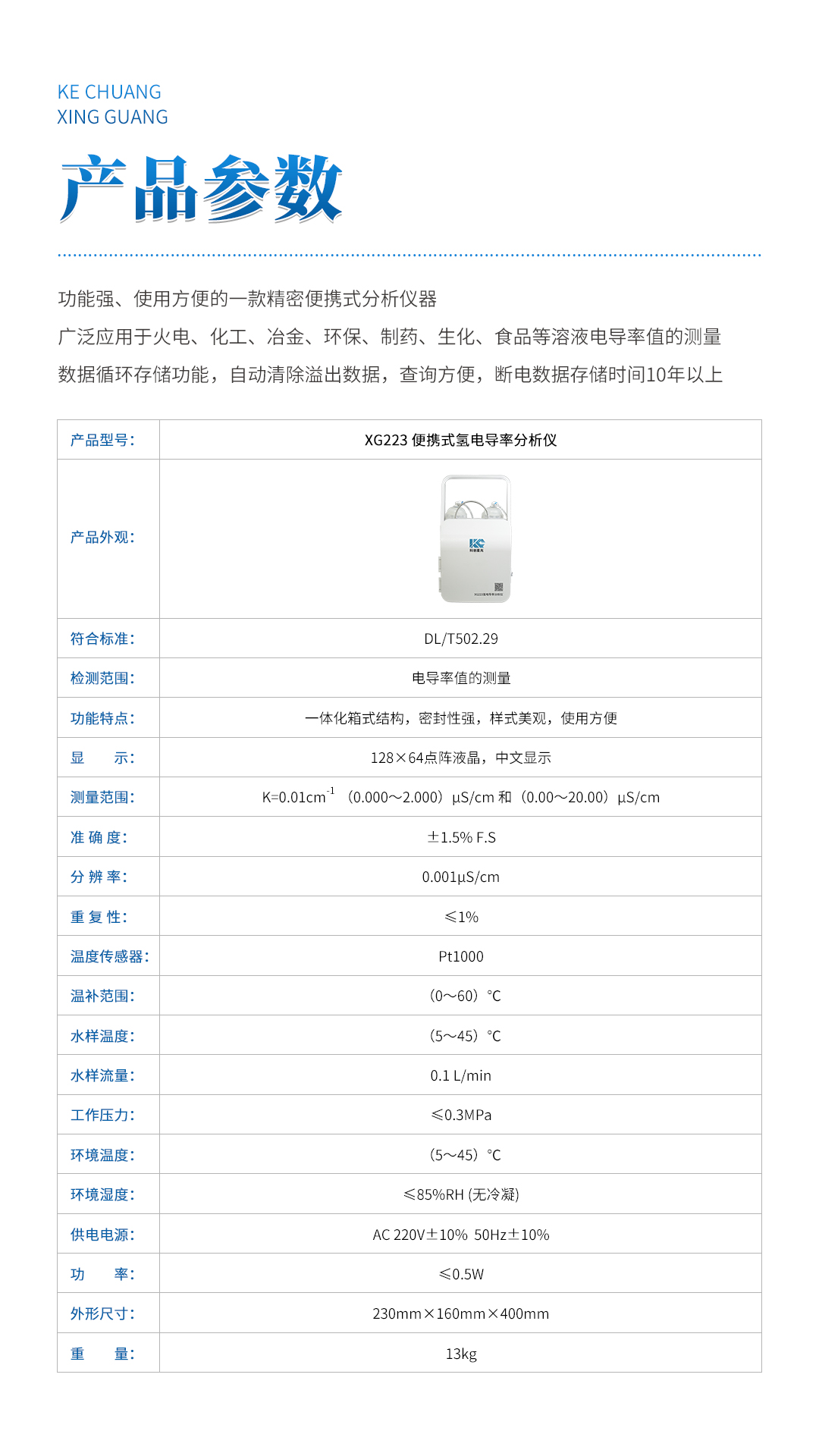 XG223 便携式氢电导率分析仪 是功能强、使用方便的一款精密便携式分析仪器。适用于DL/T502.29火力发电厂水汽分析方法 第二十九部分:氢电导率的测定。可广泛应用于火电、化工、冶金、环保、制药、生化、食品等溶液电导率值的测量。