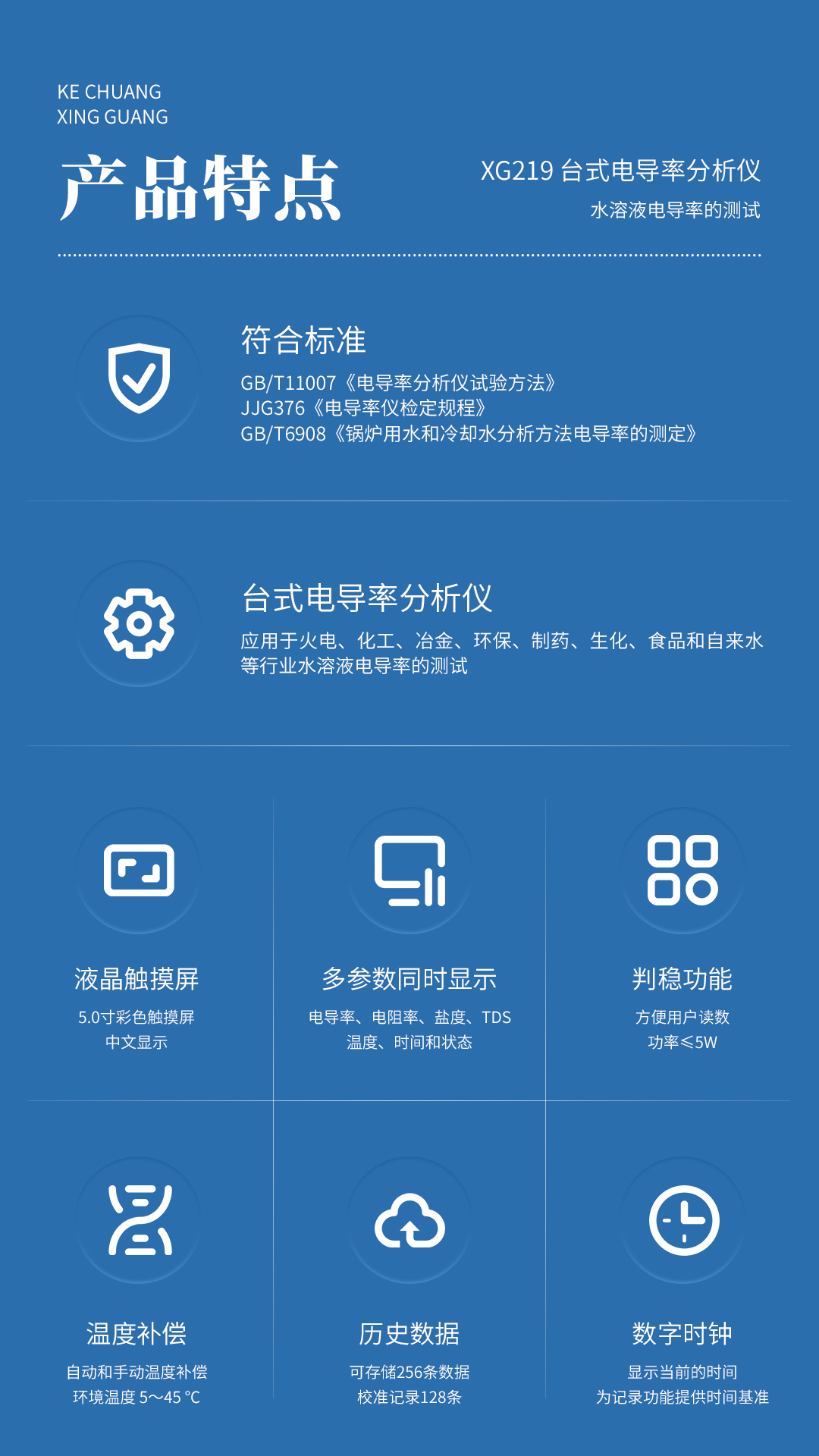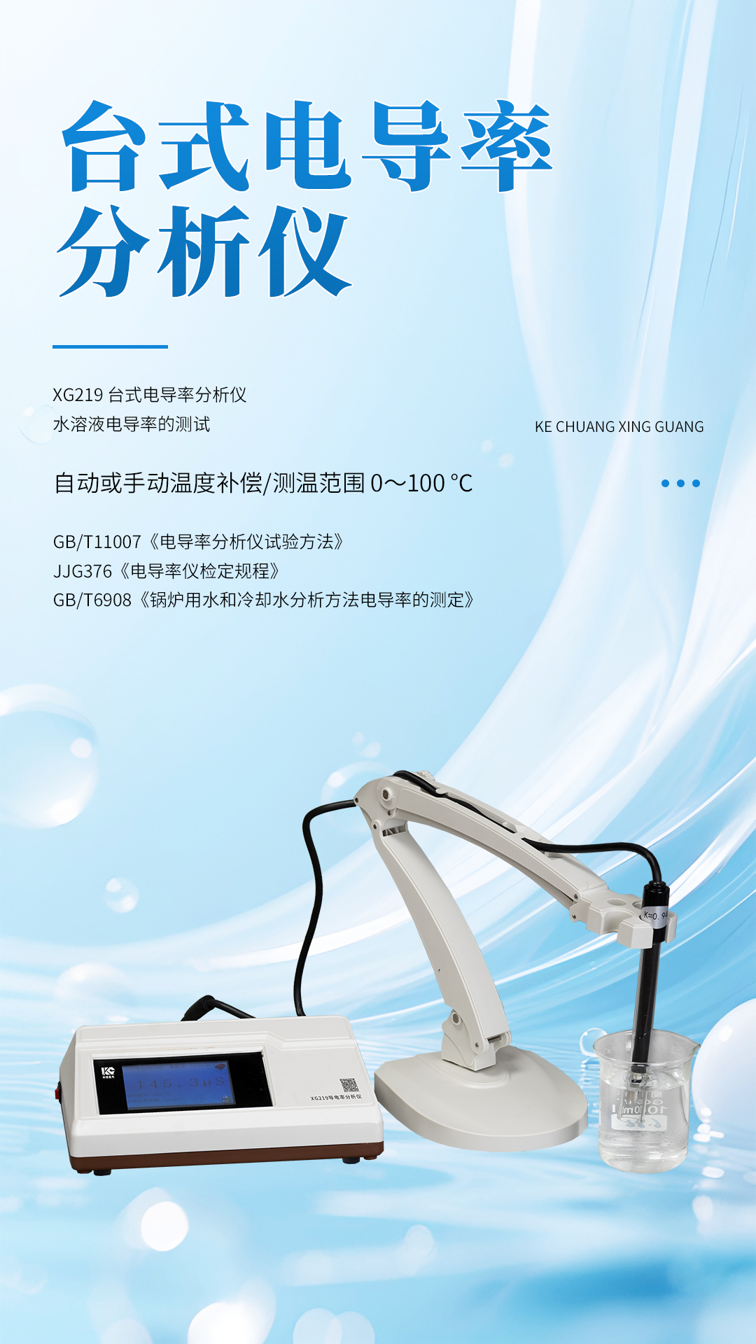 XG219 台式电导率分析仪 依据GB/T11007《电导率分析仪试验方法》和JJG376《电导率仪检定规程》标准设计制造,适用于GB/T6908《锅炉用水和冷却水分析方法电导率的测定》。应用于火电、化工、冶金、环保、制药、生化、食品和自来水等行业水溶液电导率的测试。