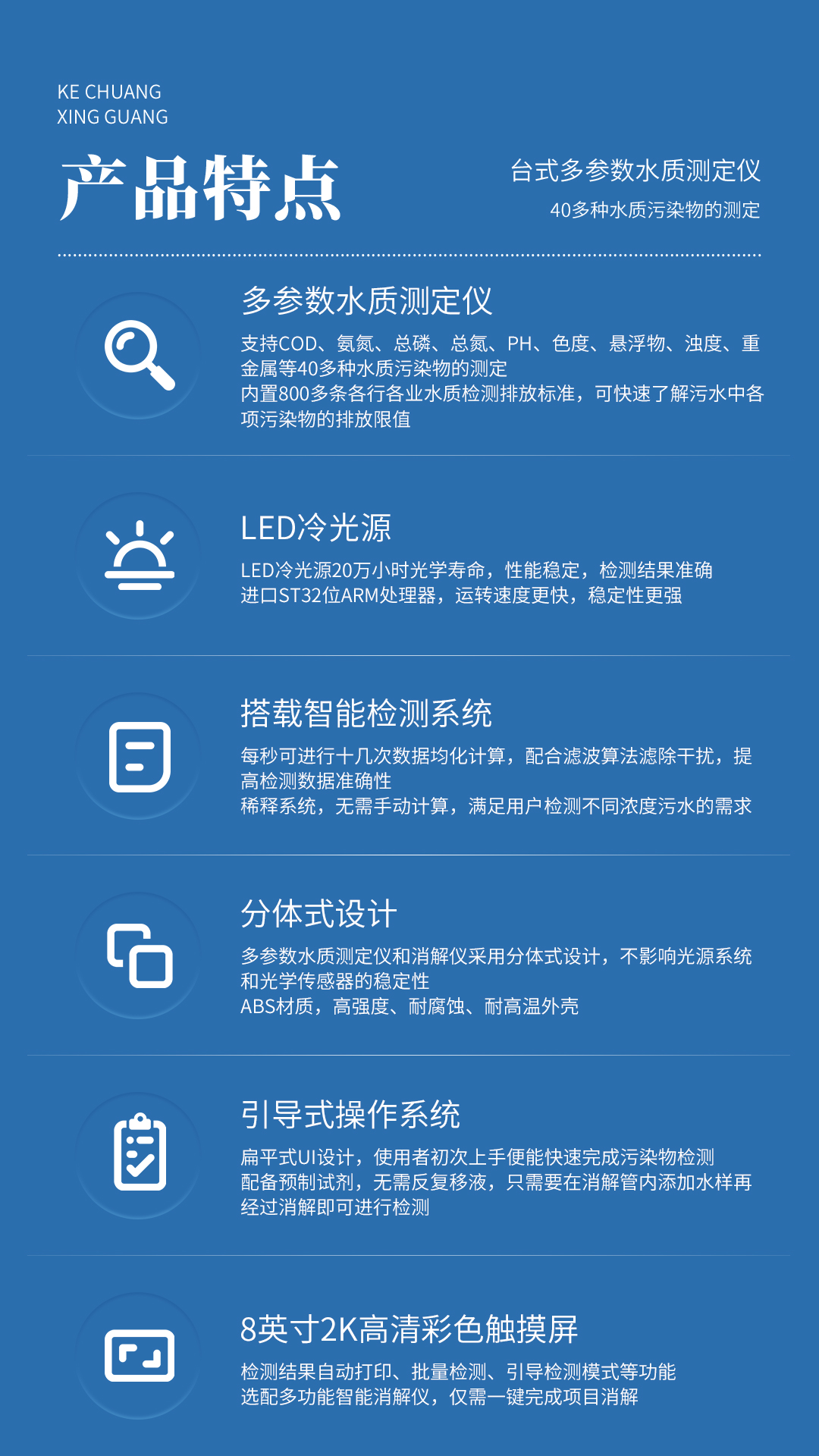 ● 支持COD、氨氮、总磷、总氮、PH、色度、悬浮物、浊度、重金属等40多种水质污染物 的测定。