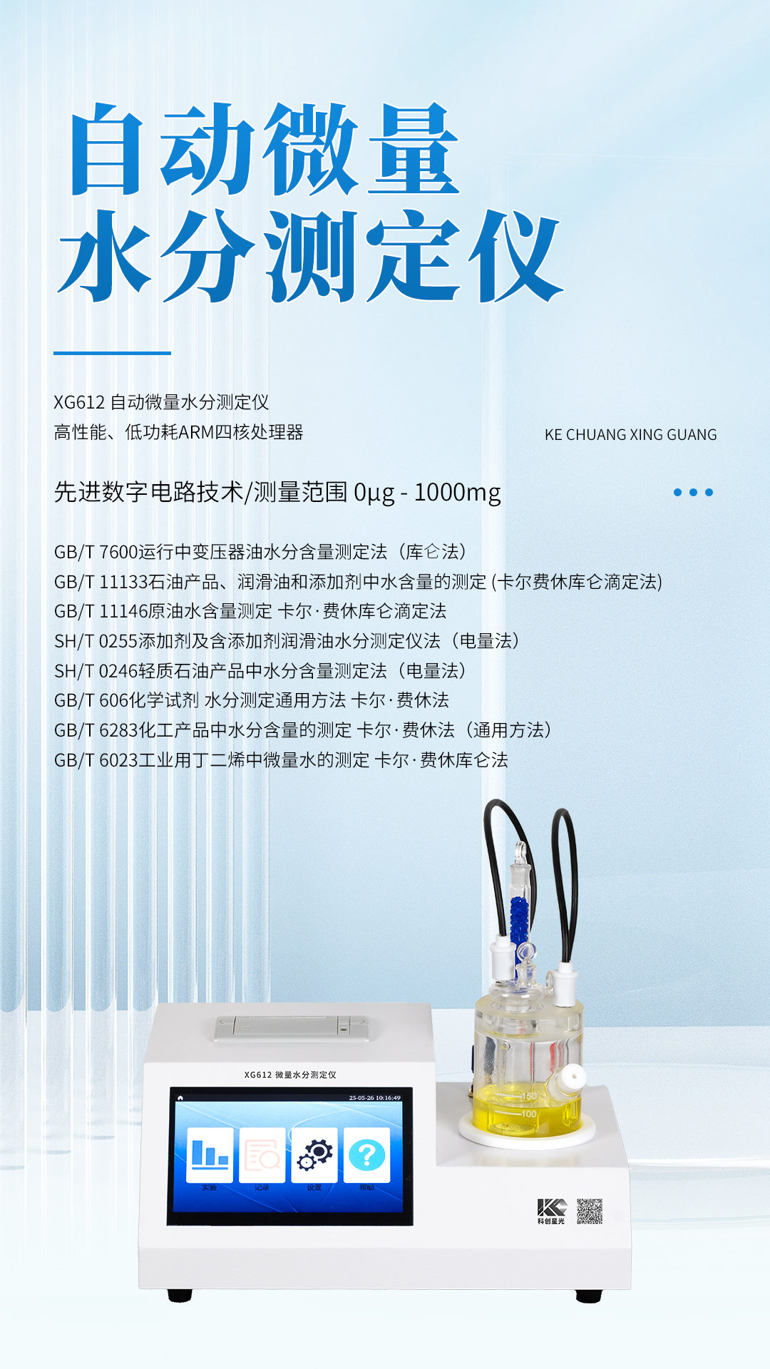 XG612 自动微量水分测定仪 使用新一代高性能、低功耗ARM四核处理器,配合自主开发的先进数字电路技术,仪器运行稳定、精度高。广泛应用于电力、石油、化工、制药、食品等行业。