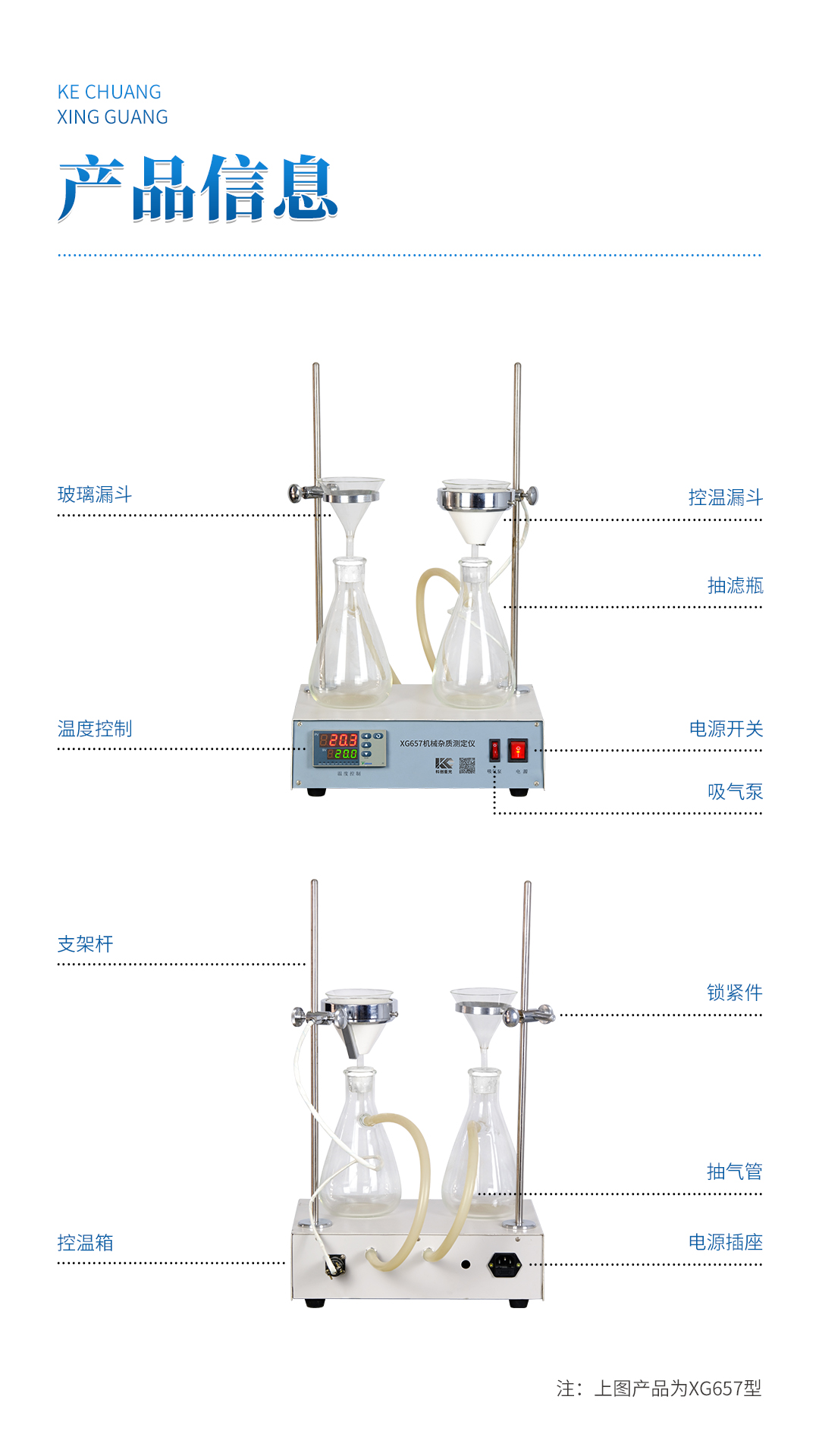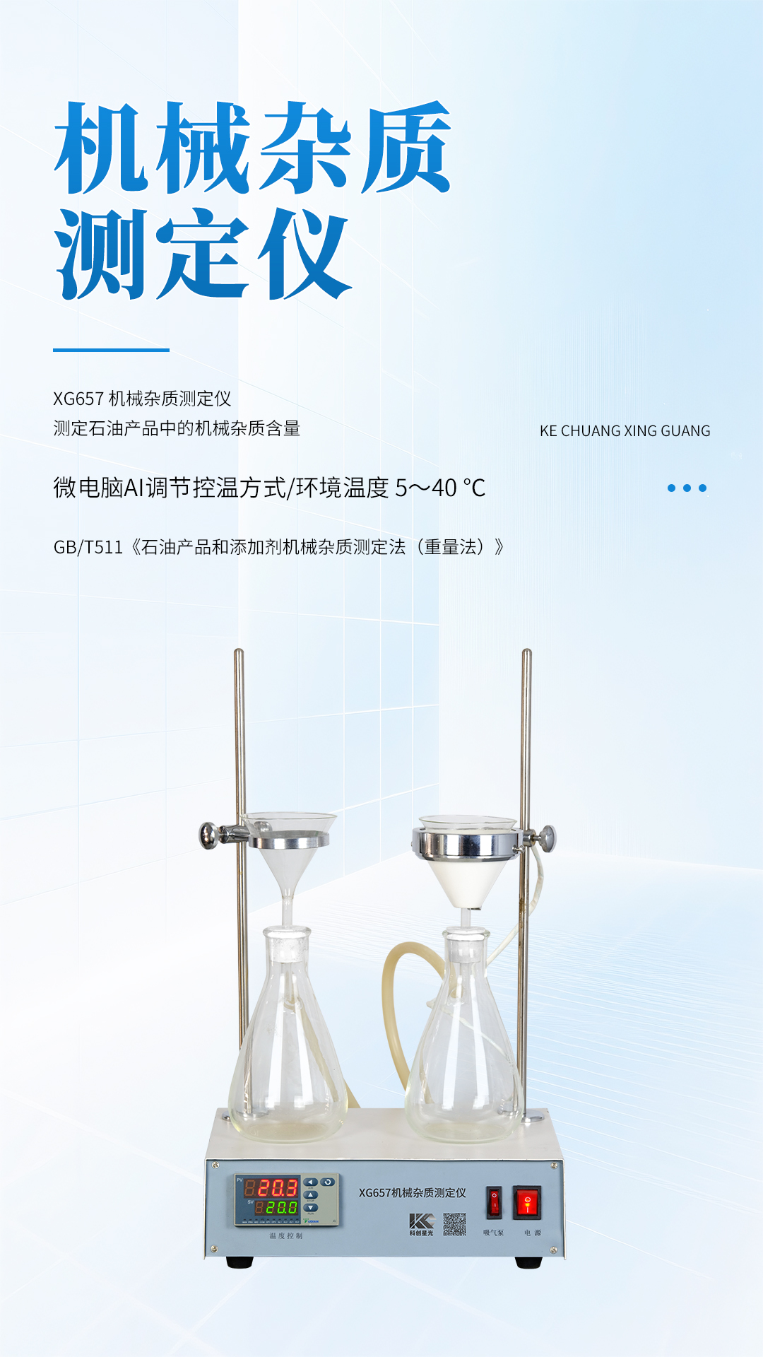 XG657 机械杂质测定仪 依据GB/T511《石油产品和添加剂机械杂质测定法(重量法)》标准,主要适用于测定石油产品中的各类轻、重质油、润滑油及添加剂的机械杂质含量,可广泛应用于电力、石油、化工、商检及科研等部门。