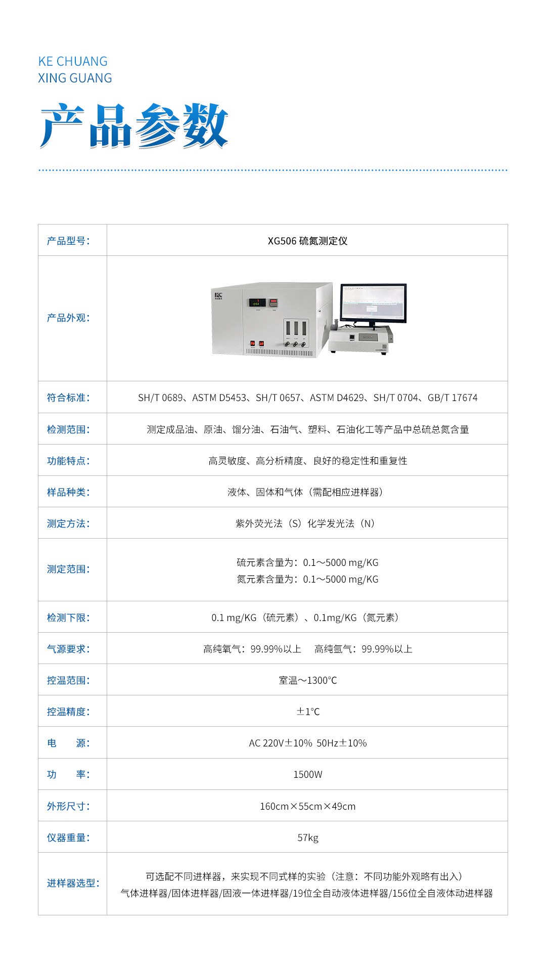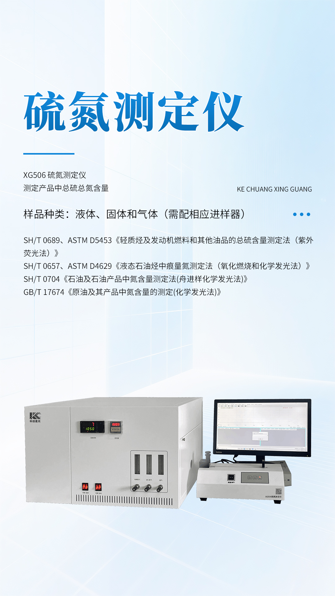 XG506 硫氮测定仪 广泛应用于测定成品油、原油、馏分油、石油气、塑料、石油化工等产品中总硫总氮含量。符合国家推荐的硫含量分析方法和氮分析方法,单一软件在同一界面上分析两种元素含量。仪器具有高灵敏度、高分析精度、良好的稳定性和重复性等优点。该仪器主要部件使用进口器件,整机性能优越,是理想的同类进口仪器替代产品。
