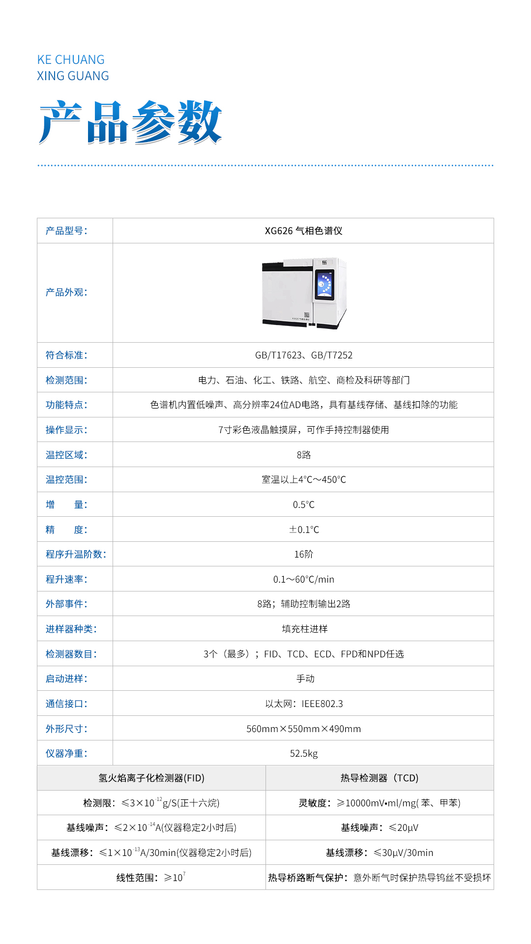 XG626 气相色谱分析仪 适用于GB/T17623《绝缘油中溶解气体组分含量的气相色谱测定法》、GB/T7252《变压器油中溶解气体分析和判断导则》。可广泛应用于电力、石油、化工、铁路、航空、商检及科研等部门。