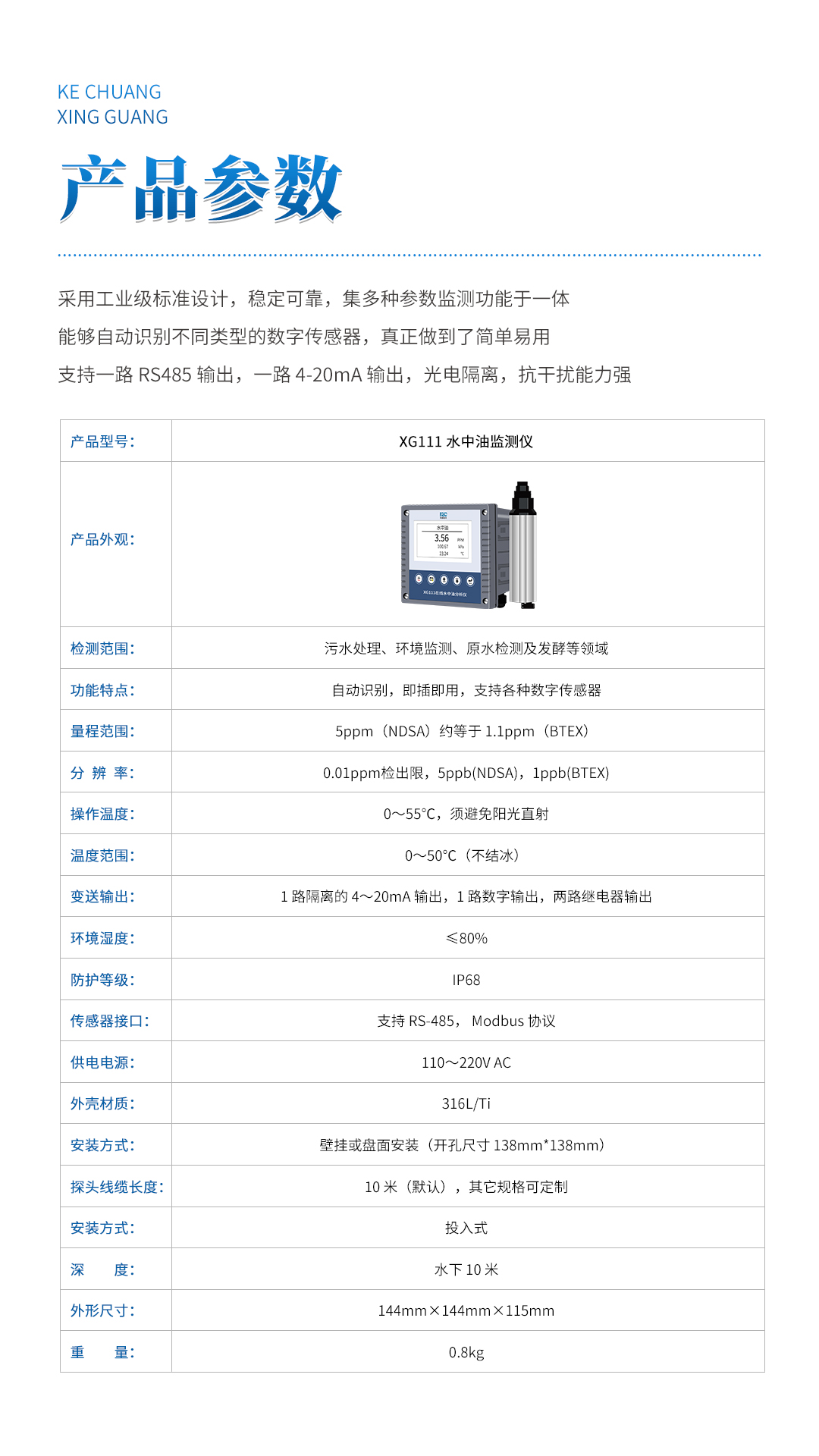 XG111 在线水中油监测仪 采用工业级标准设计,稳定可靠,集多种参数监测功能于一体,该设备能够自动识别不同类型的数字传感器,真正做到了简单易用。该设备支持一路 RS485 输出,一路 4-20mA 输出,光电隔离,抗干扰能力强。两路带隔离的继电器输出,用户可以设定继电器功能,从而来控制设备的开关状态和开关周期。主要适用于以下场合:污水处理、环境监测、原水检测及发酵等领域。