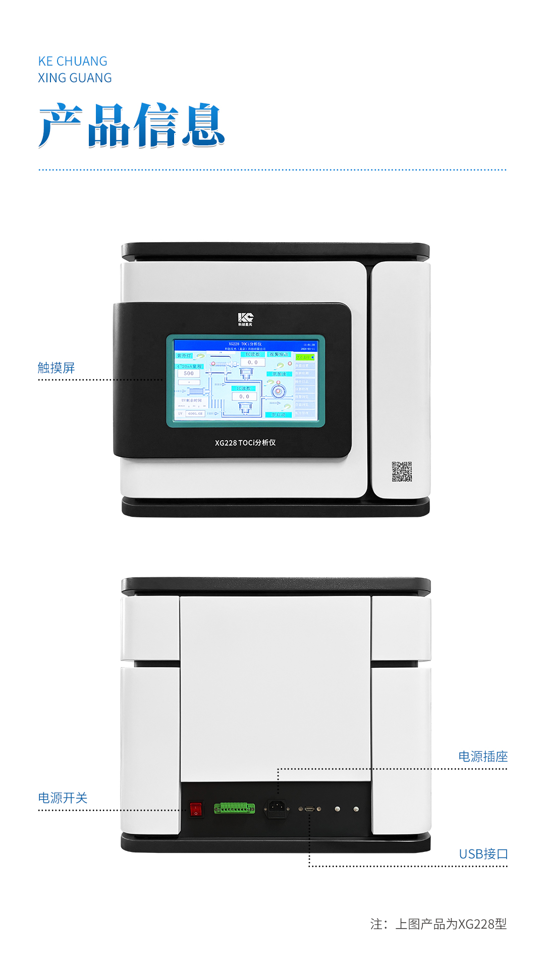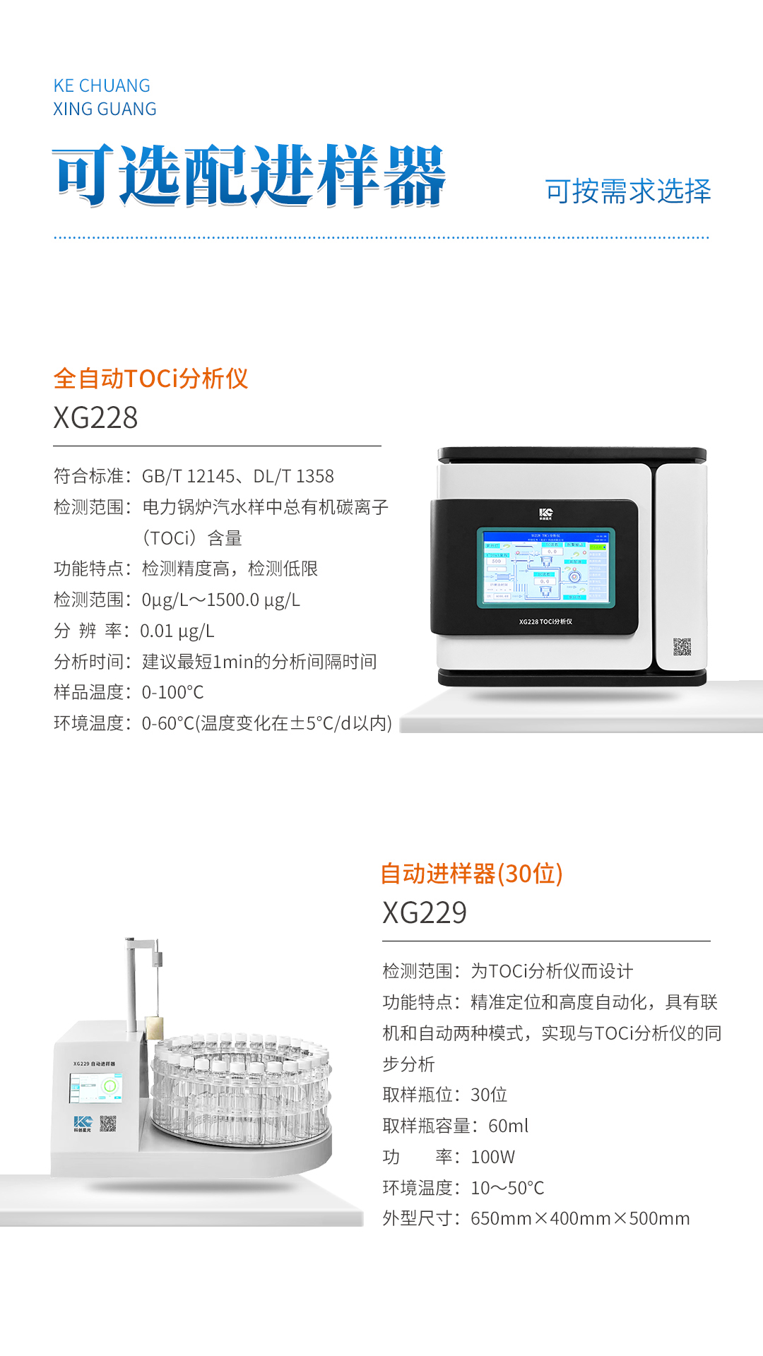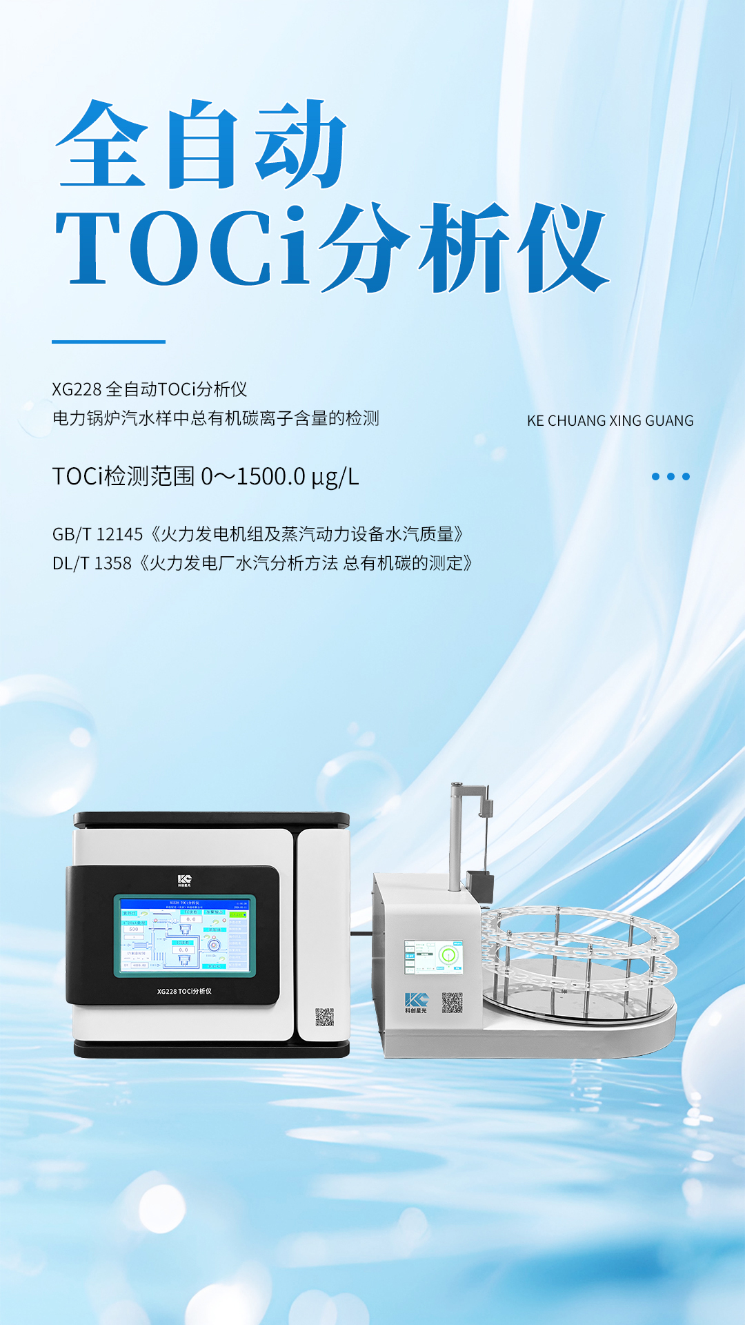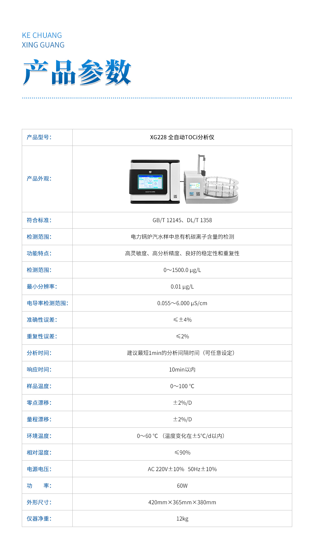 XG228 全自动TOCi分析仪 符合GB/T 12145《火力发电机组及蒸汽动力设备水汽质量》、DL/T 1358《火力发电厂水汽分析方法 总有机碳的测定》标准,适用于电力锅炉汽水样中总有机碳离子(TOCi)含量的检测,可以检测TOCi浓度从0µg/L~1500.0µg/L的水样,仪器具有高灵敏度、高分析精度、良好的稳定性和重复性等优点。