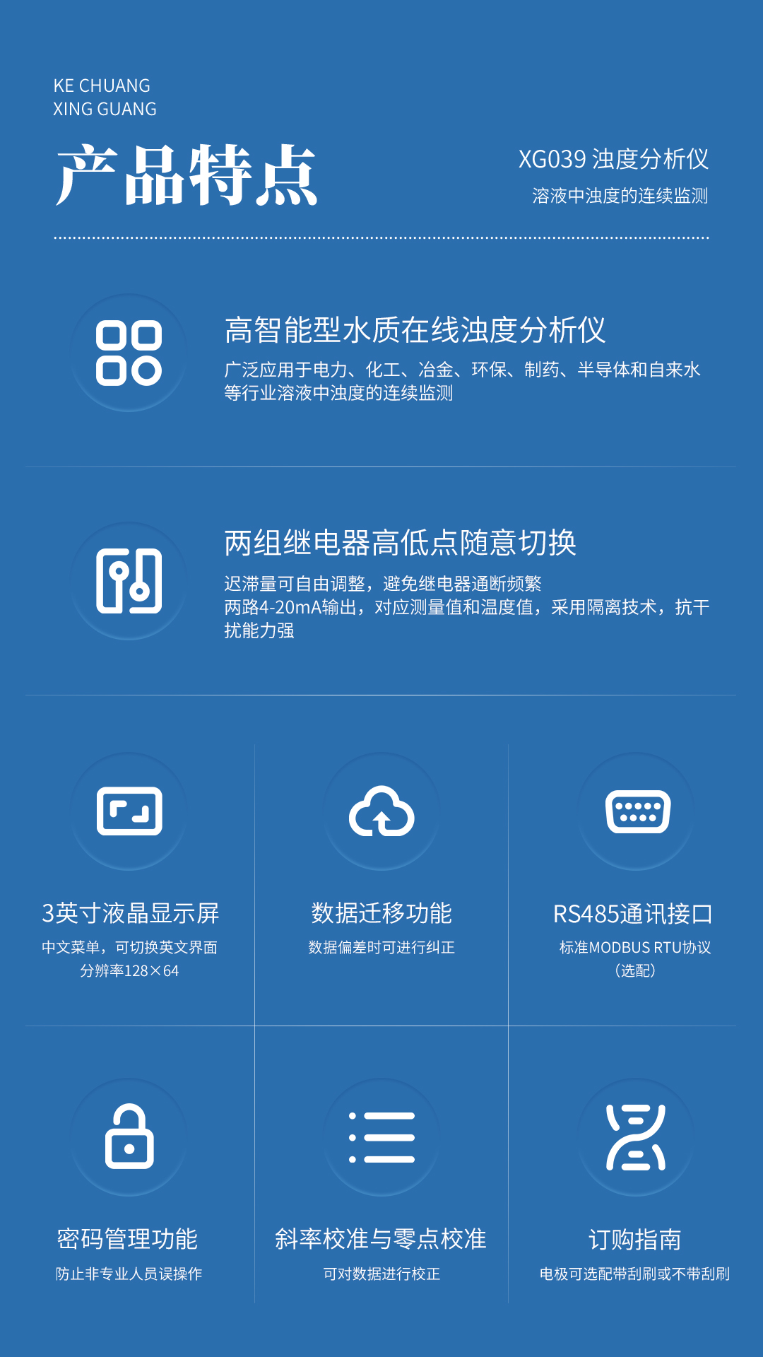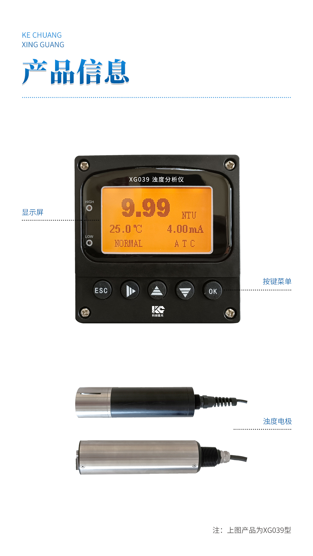 XG039 浊度分析仪 是我公司新一代高智能型水质在线浊度分析仪,可广泛应用于电力、化工、冶金、环保、制药、半导体和自来水等行业溶液中浊度的连续监测。