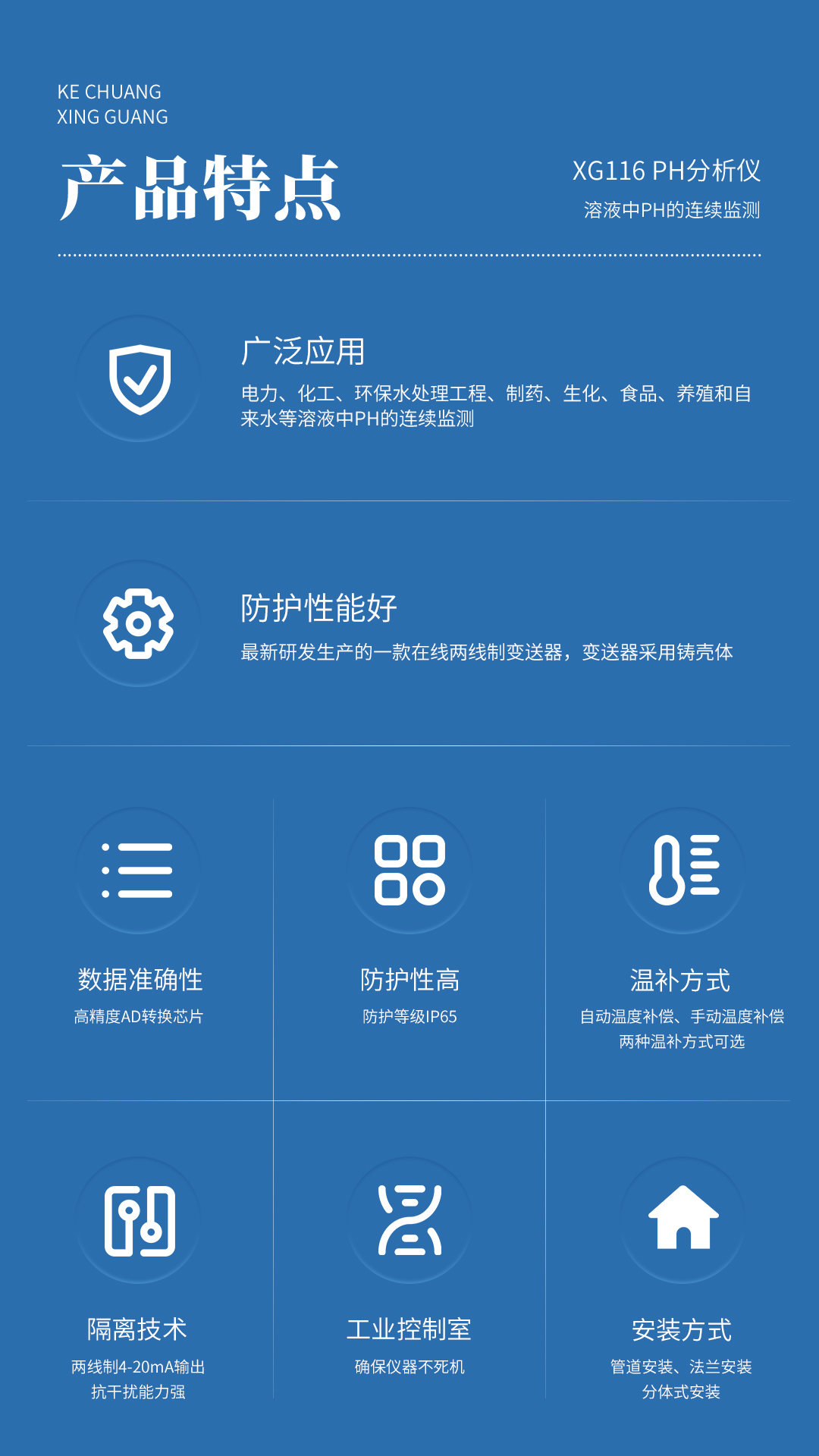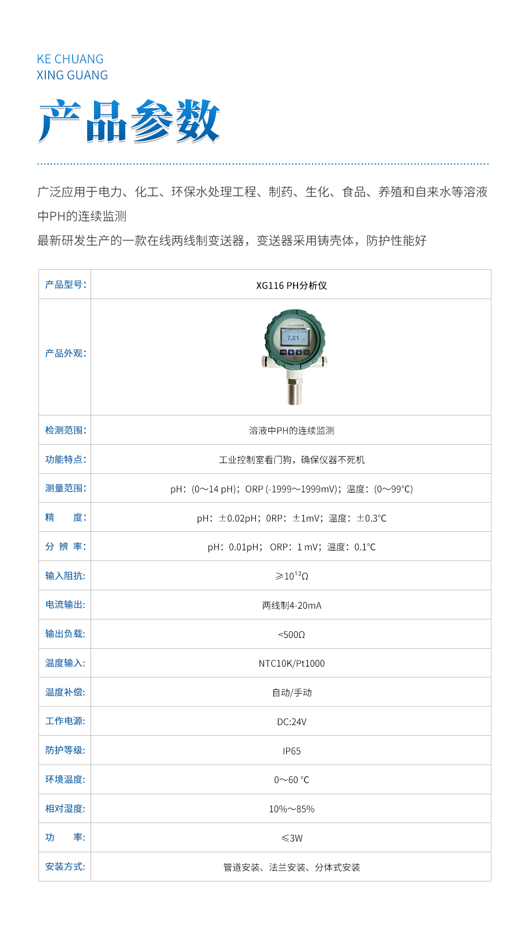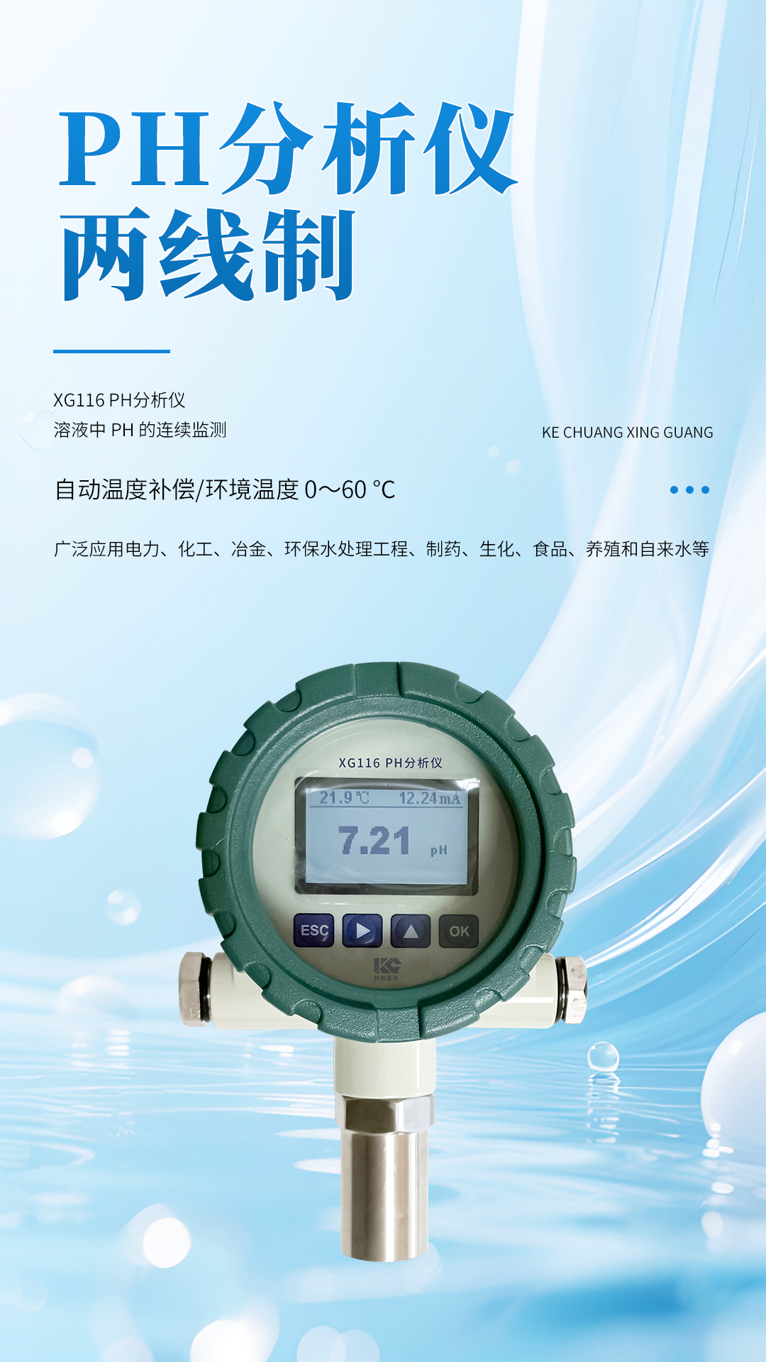 XG116 PH分析仪 是我公司最新研发生产的一款在线两线制变送器,变送器采用铸壳体,防护性能好,可广泛应用于电力、化工、环保水处理工程、制药、生化、食品、养殖和自来水等溶液中PH的连续监测。
