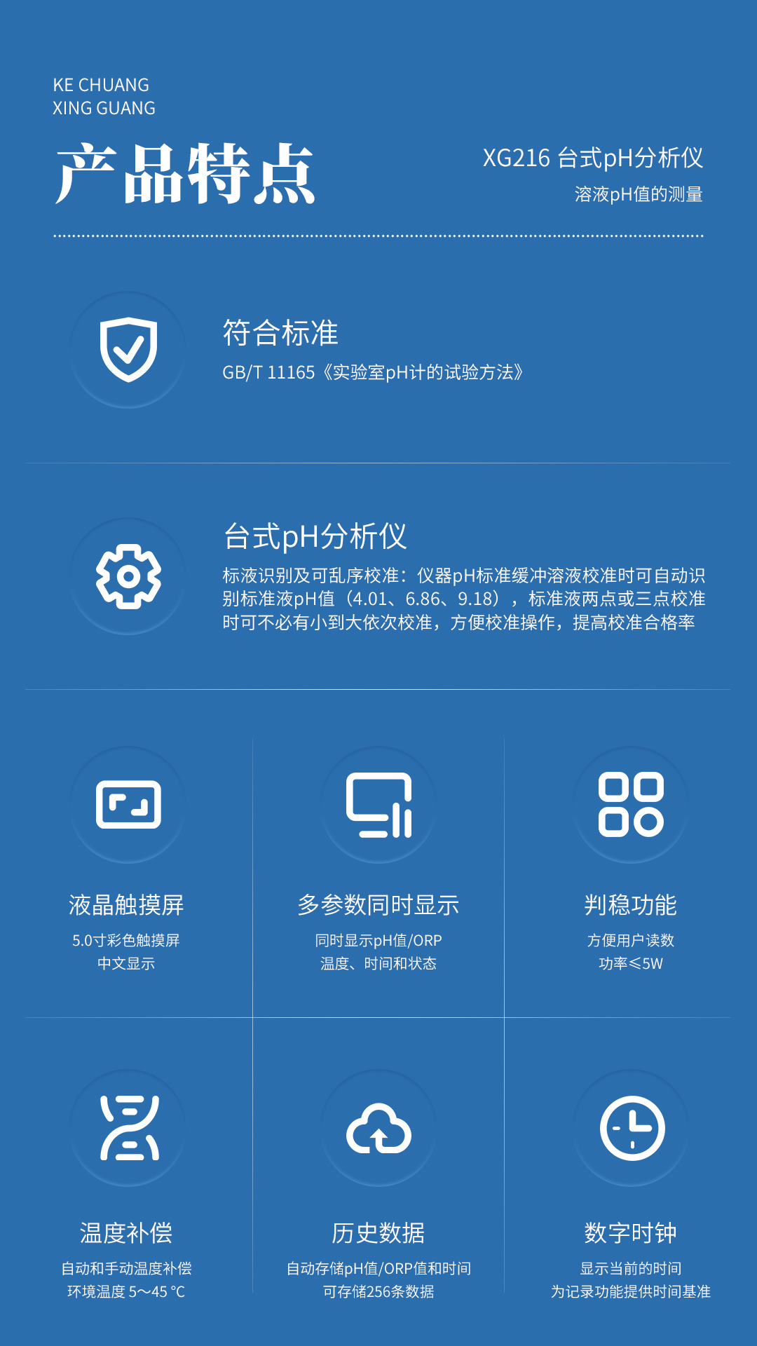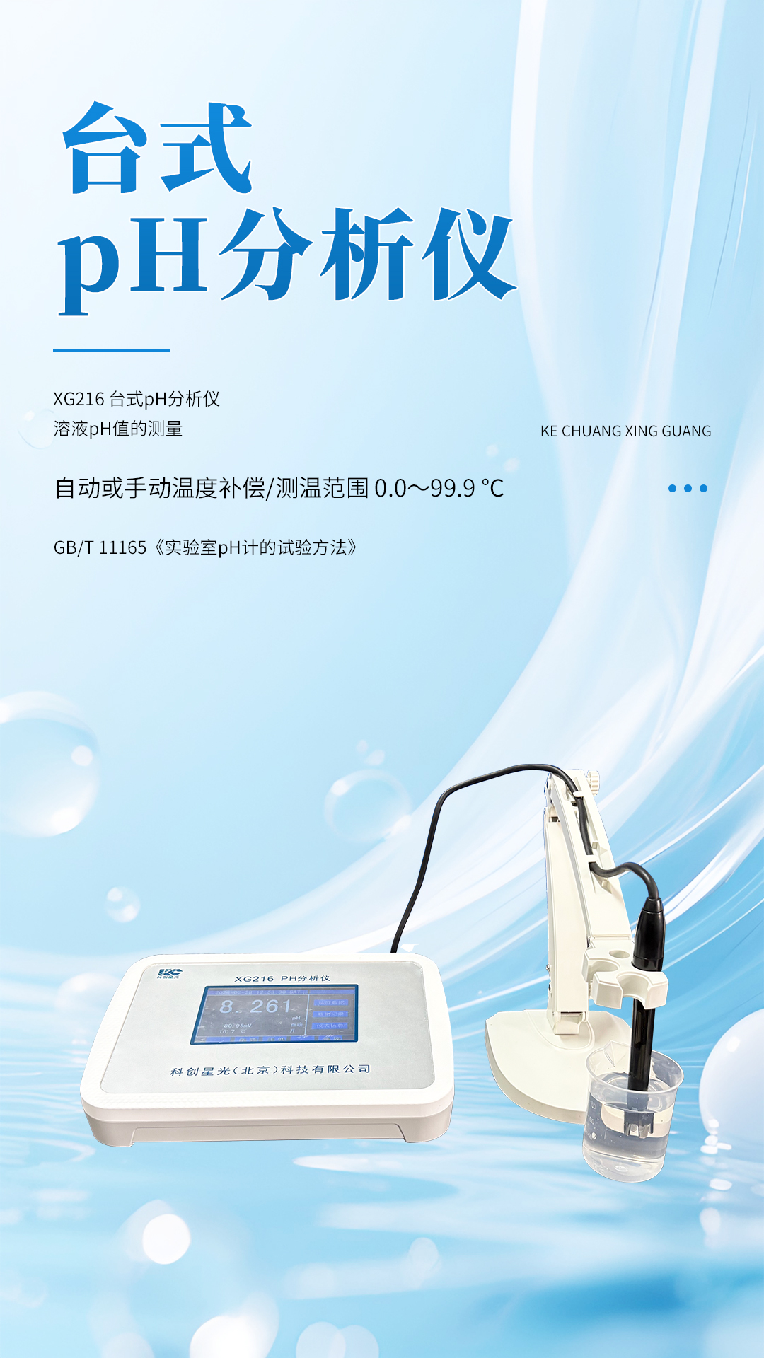 XG216型 台式pH分析仪 符合标准GB/T 11165《实验室pH计的试验方法》,可用于电厂、化工、冶金、环保、制药、生化、食品等溶液pH值的测量。