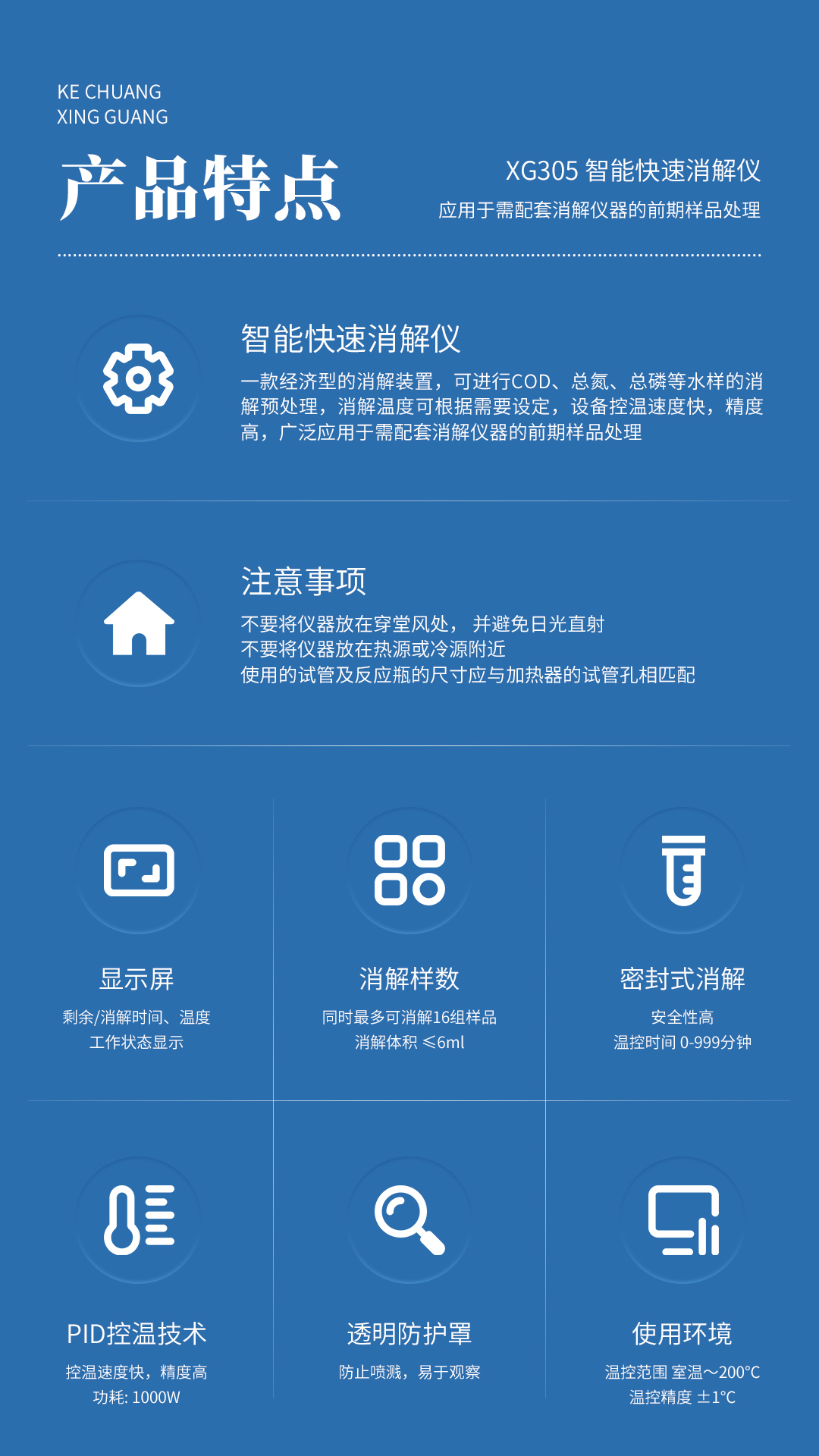 XG305 智能快速消解仪 是一款经济型的消解装置,可进行COD、总氮、总磷等水样的消解预处理,消解温度可根据需要设定,设备控温速度快,精度高,广泛应用于需配套消解仪器的前期样品处理。