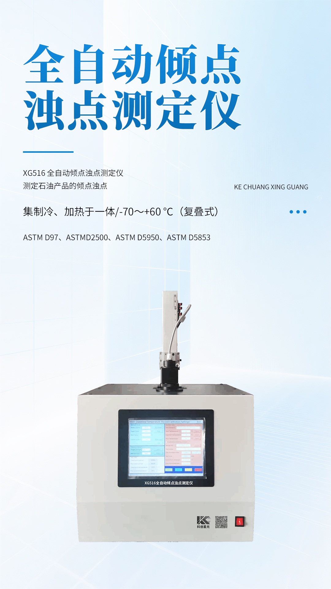 XG516 全自动倾点浊点测定仪 执行标准:ASTM D97、ASTMD2500、ASTM D5950、ASTM D5853,用于测定石油产品的倾点浊点。全自动倾点浊点测定仪采用单个测试浴的测定方式,操作者可以通过键盘、触摸屏或鼠标操作控制仪器,整个过程全自动,而且整个测试过程可以观察到油样的流动情况。