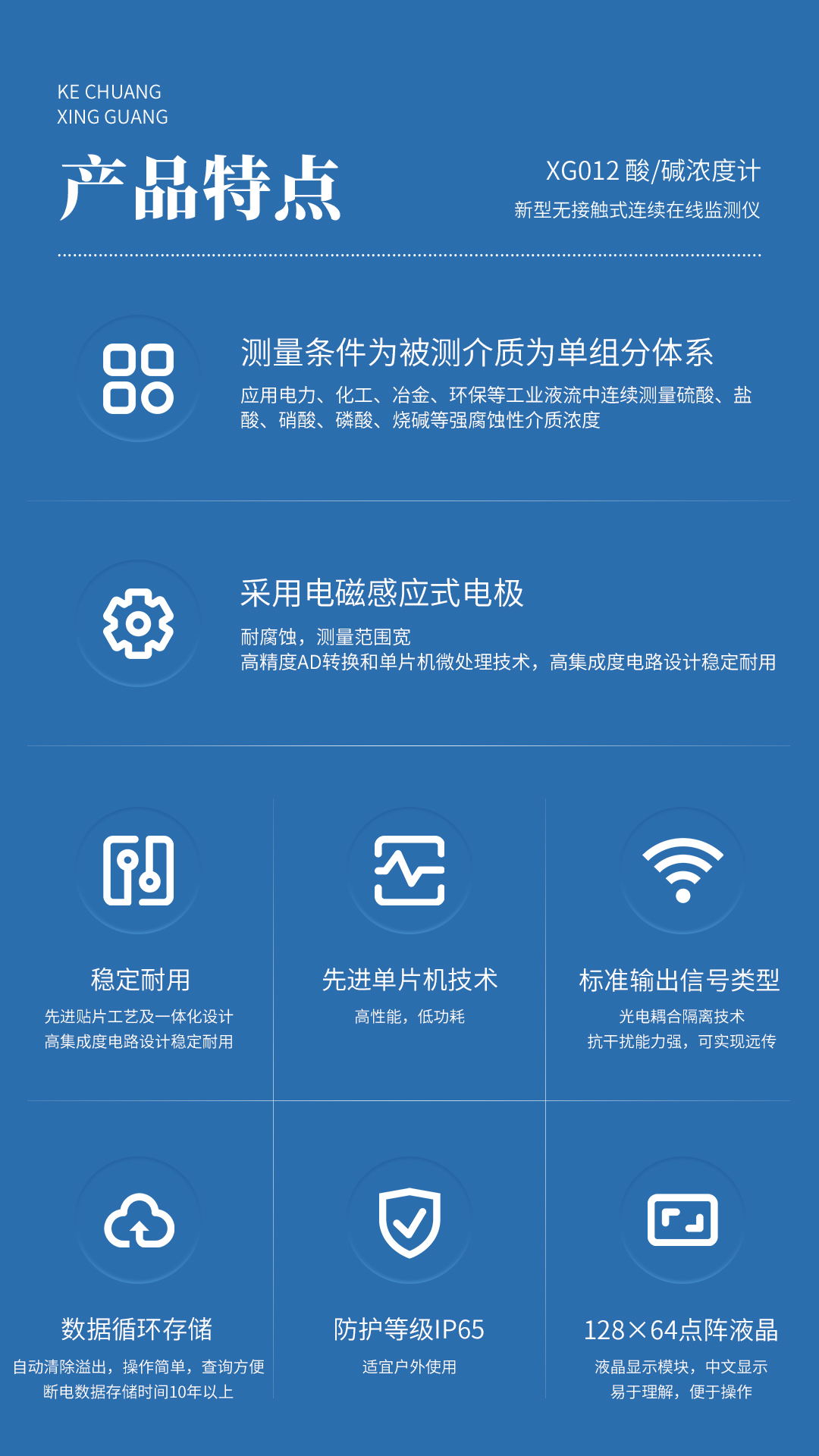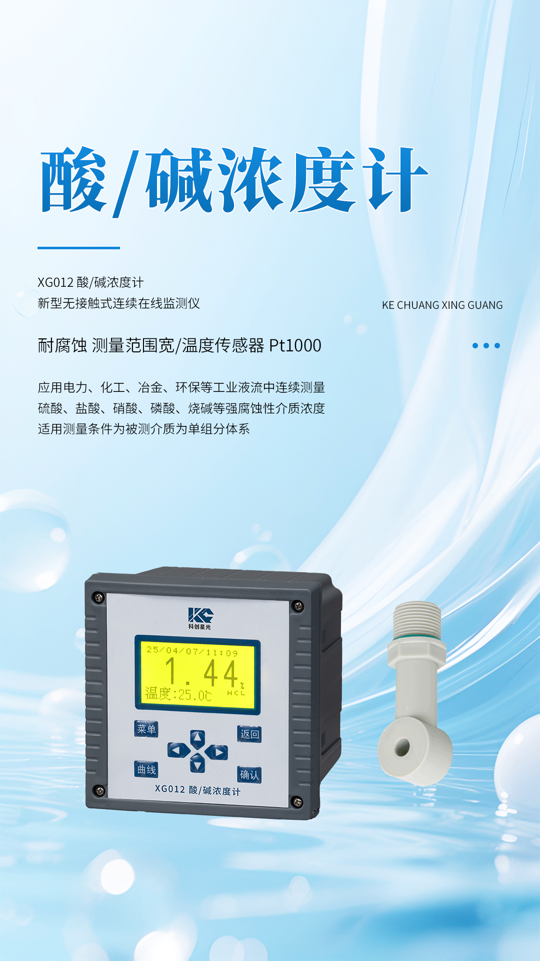 XG012型 酸/碱浓度计 是根据电磁感应原理设计的一种新型无接触式连续在线监测仪。仪器采用无极式传感器,传感器采用一对线绕合金环形线圈,传感器的探头与被测过程溶液体是完全隔离的(非接触)。两个线圈,一个作为发送器,另一个作为接收器。广泛应用于电力、化工、冶金、环保等工业液流中连续测量硫酸、盐酸、硝酸、磷酸、烧碱等强腐蚀性介质浓度。其适用测量条件为被测介质为单组分体系。