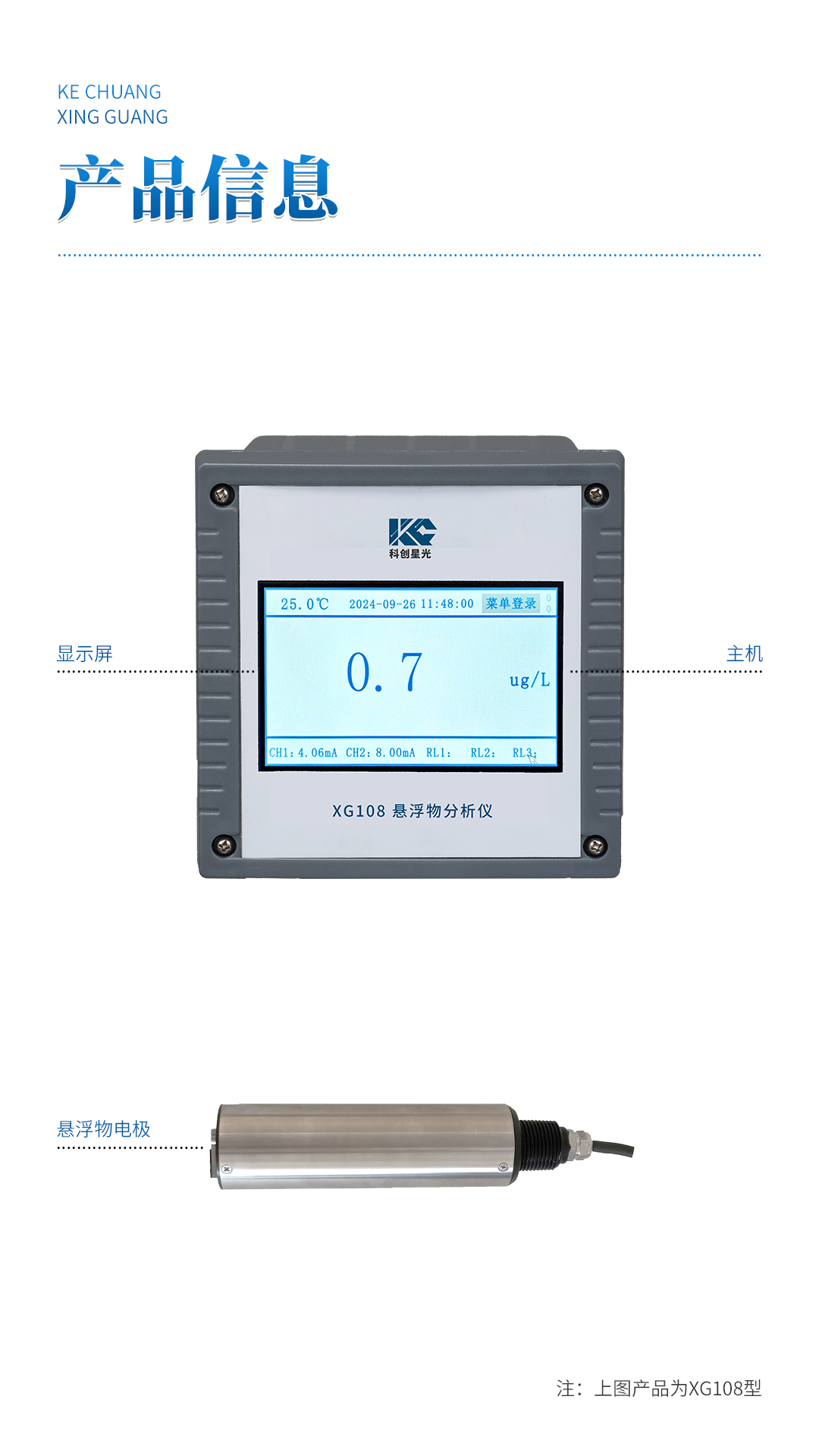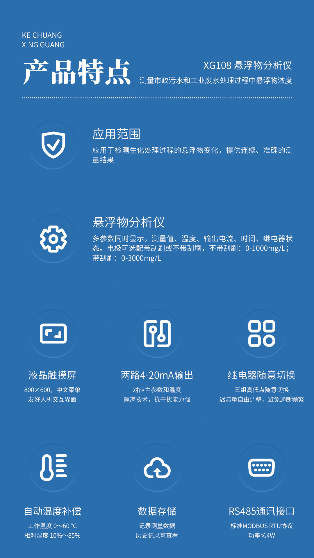 XG108 悬浮物分析仪 专为测量市政污水和工业废水处理过程中悬浮物浓度而设计的在线监测仪表。可应用于检测生化处理过程的悬浮物变化,提供连续、准确的测量结果。