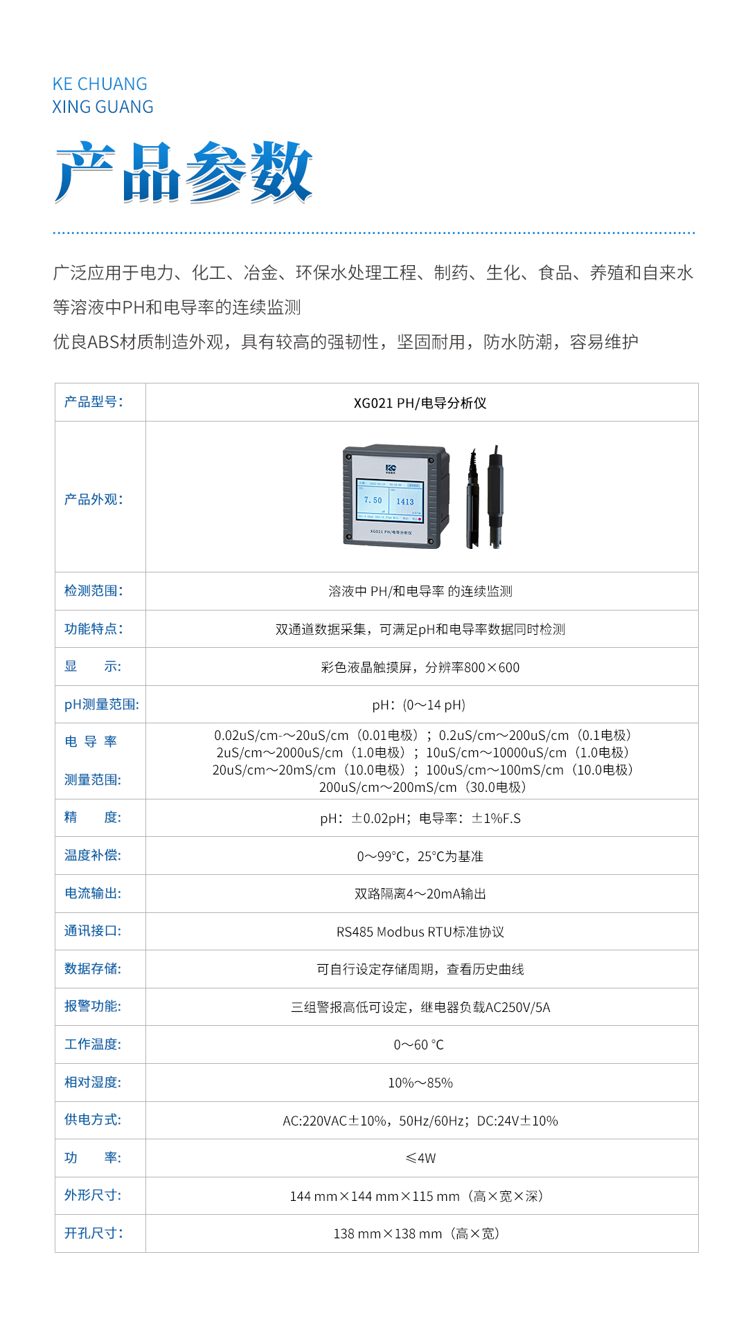 XG021 PH/电导分析仪 广泛应用于电力、化工、冶金、环保水处理工程、制药、生化、食品、养殖和自来水等溶液中PH和电导率的连续监测。
