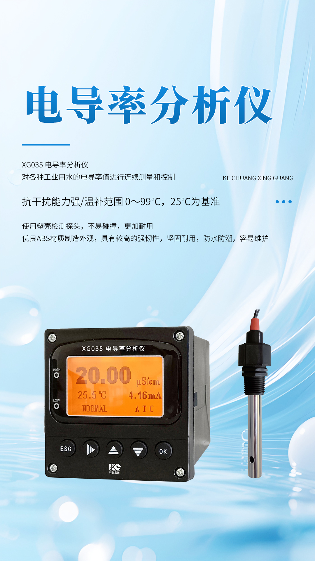 XG035 电导率分析仪 可对各种工业用水的电导率值进行连续测量和控制,本装置广泛应用于城市污水处理厂、电力、化工、制药、环保、冶金、造纸、食品、饮料及供水等行业。