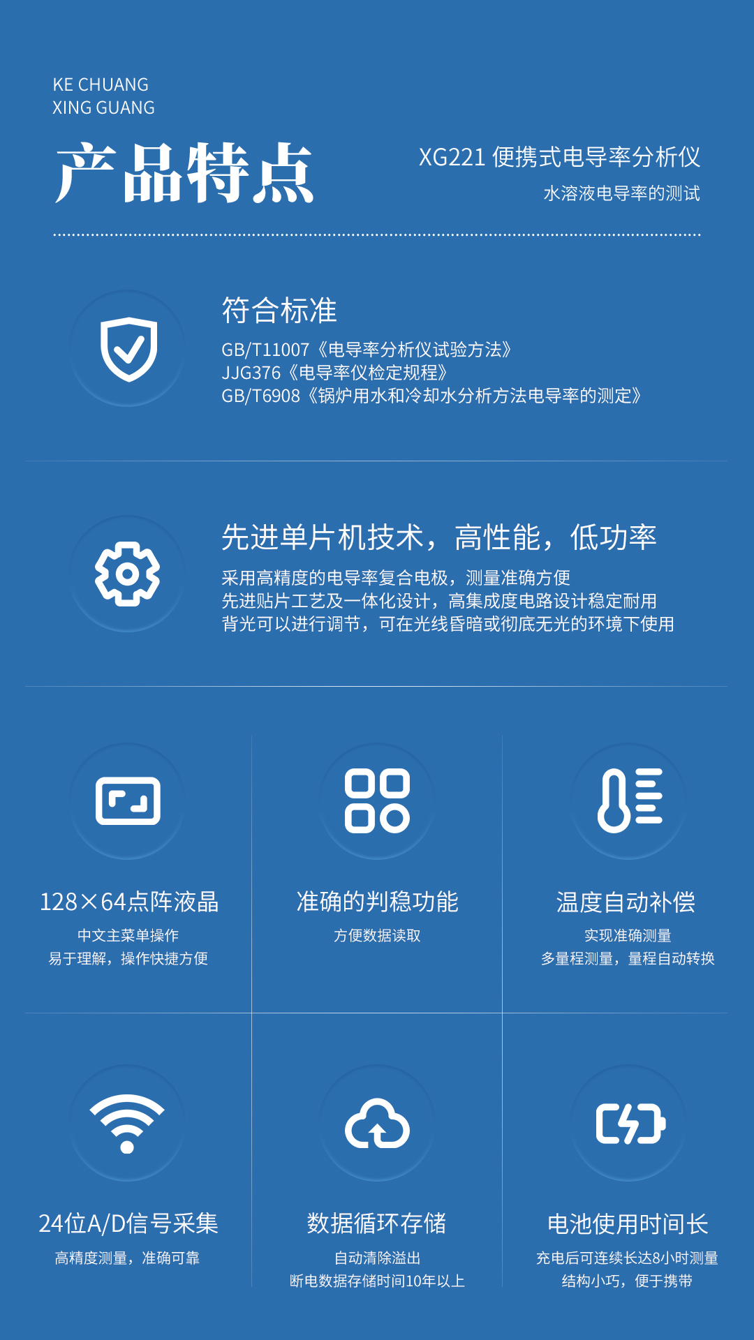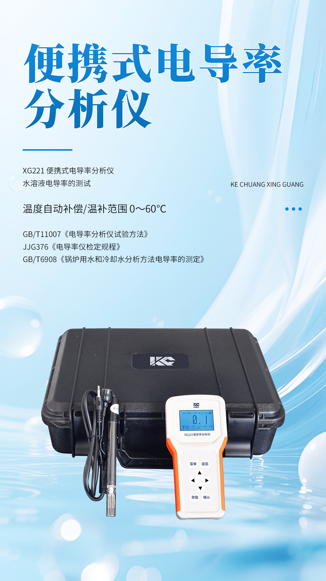 XG221 便携式电导率分析仪 依据GB/T11007《电导率分析仪试验方法》和JJG376《电导率仪检定规程》标准设计制造。适用于GB/T6908《锅炉用水和冷却水分析方法电导率的测定》,应用于火电、化工、冶金、环保、制药、生化、食品和自来水等行业水溶液电导率的测试。