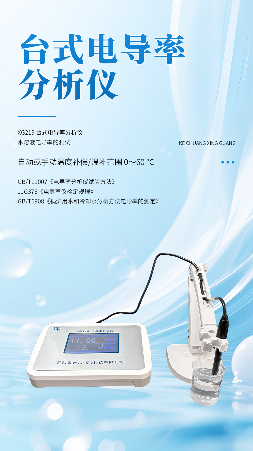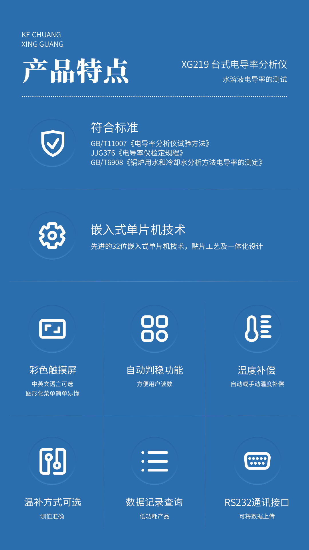 XG219 台式电导率分析仪 依据GB/T11007《电导率分析仪试验方法》和JJG376《电导率仪检定规程》标准设计制造,适用于GB/T6908《锅炉用水和冷却水分析方法电导率的测定》。应用于火电、化工、冶金、环保、制药、生化、食品和自来水等行业水溶液电导率的测试。
