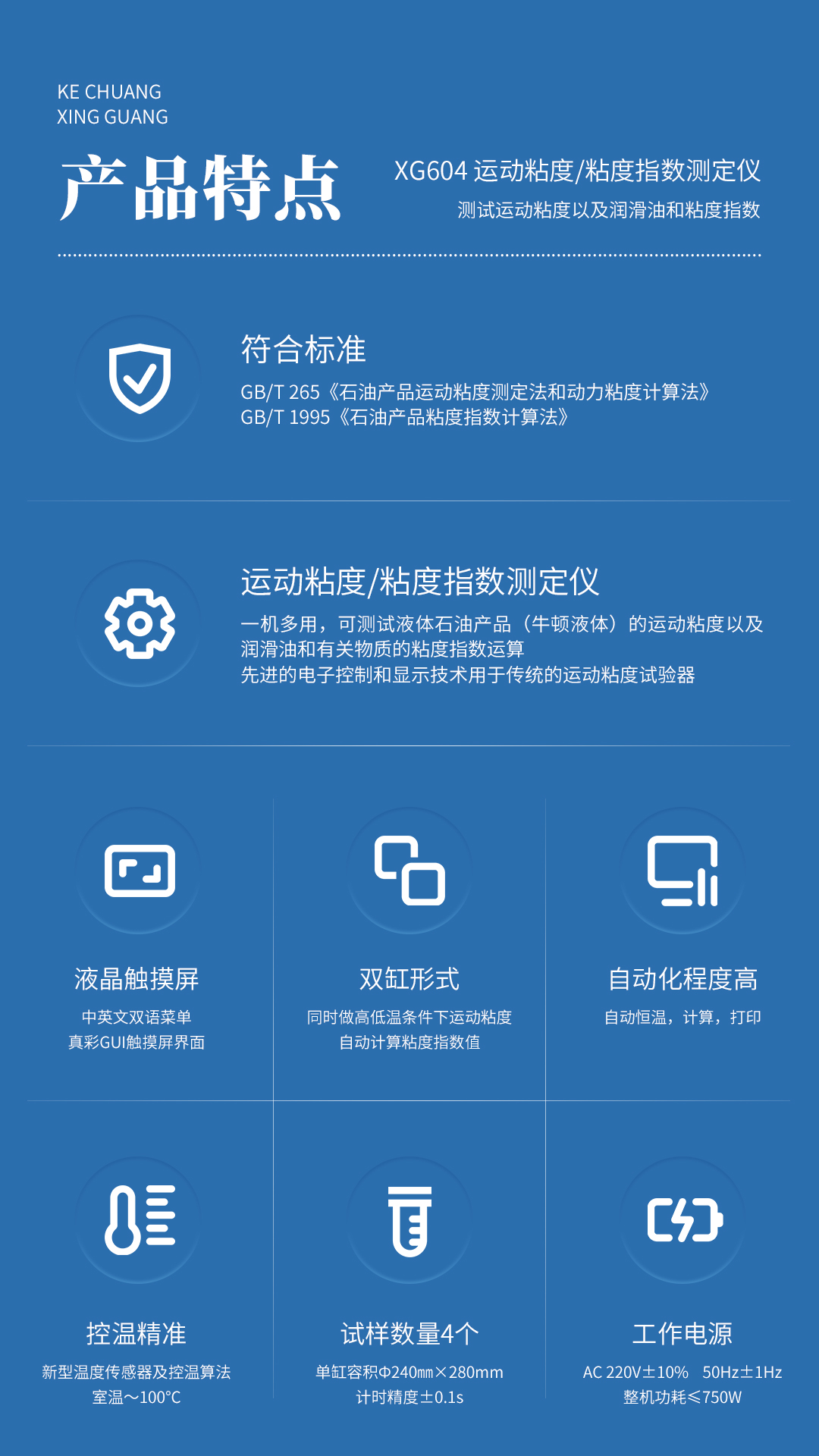 XG604 运动粘度/粘度指数测定仪 依据GB/T 265《石油产品运动粘度测定法和动力粘度计算法》、GB/T 1995《石油产品粘度指数计算法》所规定的要求设计制造。适用于按GB/T265标准规定,测定液体石油产品(指牛顿液体)在某一恒定温度条件下的运动粘度和粘度指数。可广泛应用于电力、石油化工、钢铁冶金、检测机构、科研院所、大专院校、铁路、航空、计量等部门。