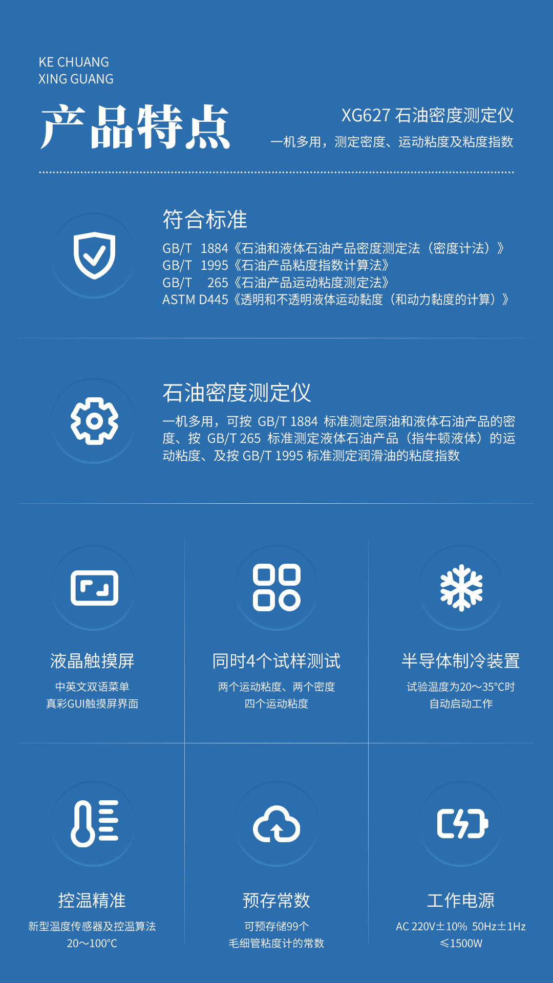 XG627 石油密度测定仪 依据GB/T 1884《石油和液体石油产品密度测定法(密度计法)》所规定的要求设计制造。同时可兼顾GB/T 1995《石油产品粘度指数计算法》、GB/T265《石油产品运动粘度测定法》、ASTM D445《透明和不透明液体运动黏度(和动力黏度的计算)》标准。可广泛应用于电力、石油化工、钢铁冶金、检测机构、科研院所、大专院校、铁路、航空、计量等部门。