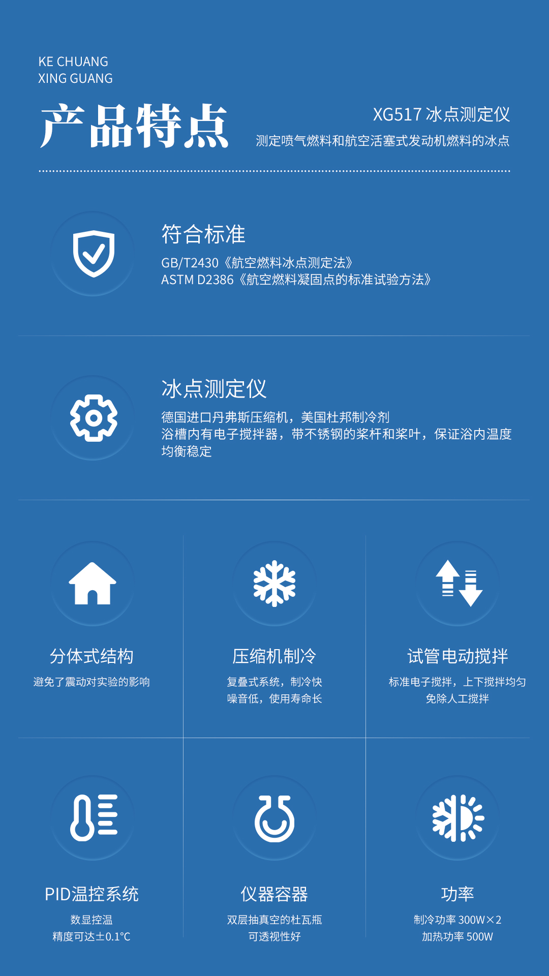 XG517 冰点测定仪 依据GB/T2430《航空燃料冰点测定法》和ASTM D2386《航空燃料凝固点的标准试验方法》所规定的要求设计制造。用于测定喷气燃料和航空活塞式发动机燃料的冰点。