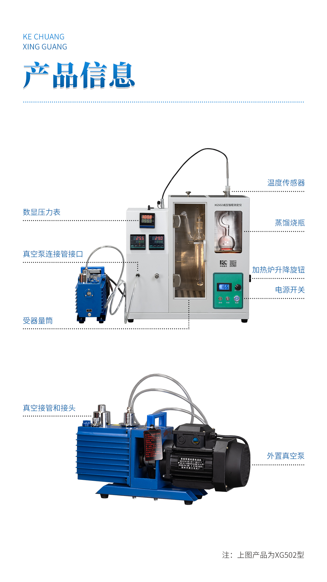 XG502 减压馏程测定仪 符合SH/T0165《高沸点范围石油产品高真空蒸馏测定法》标准,采用压力传感器和数显压力表组成真空测量显示系统代替水银U型管检测负压,外壳采用钣金材质,安装方便,并配有照明灯、连续可调功率加热炉、加热炉冷却装置。广泛应用于炼油厂、铁路、航运、石油公司及油料商业部门对石油产品的蒸馏测定。